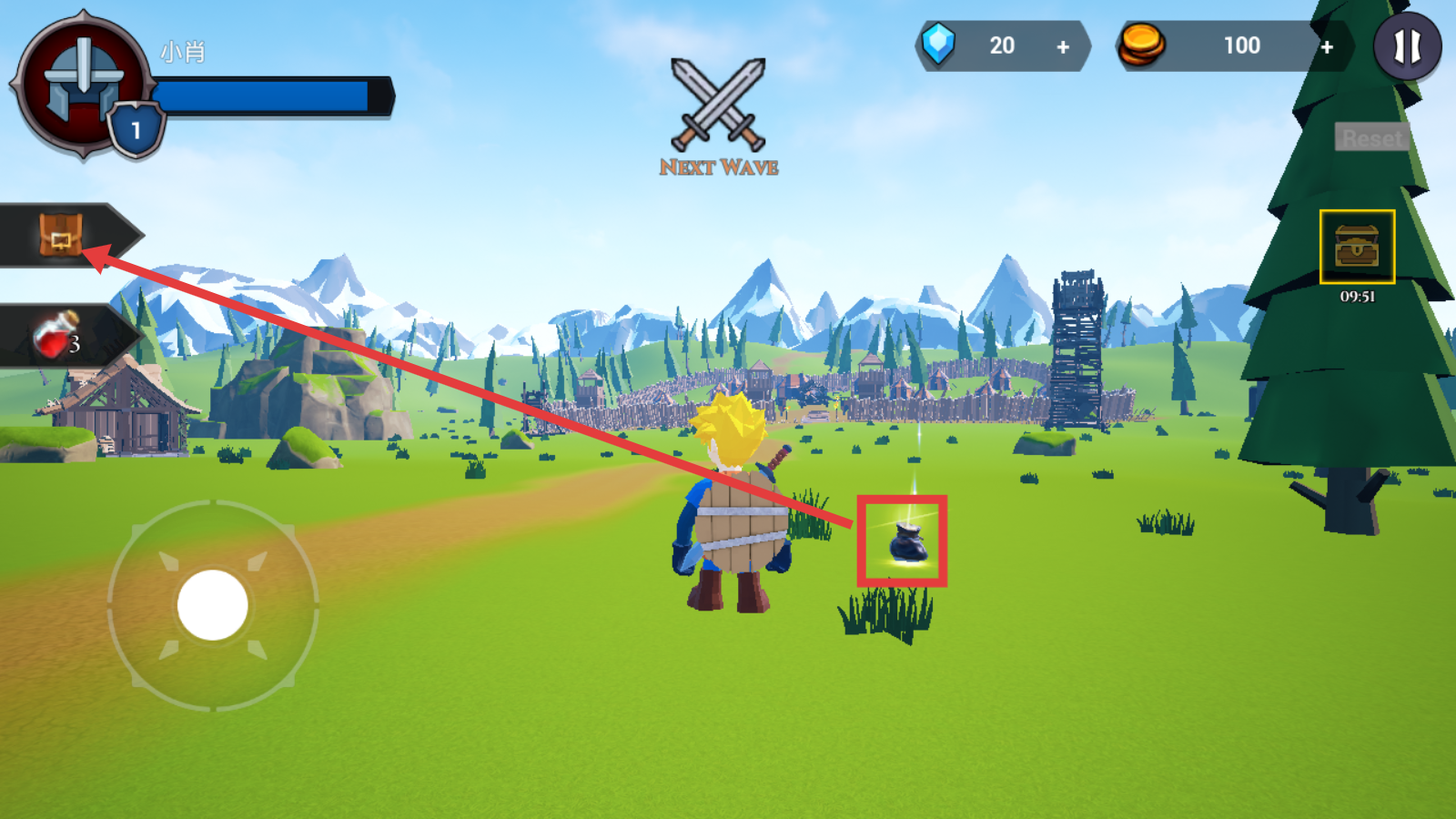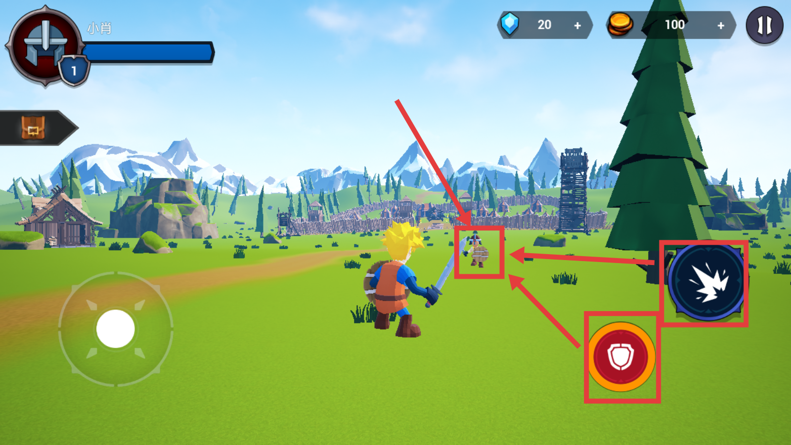 1、操控【小肖】时,通过左下摇杆移动,留意左上角等级与血量条,初始资源【钻石-20】【金币-100】需合理规划。