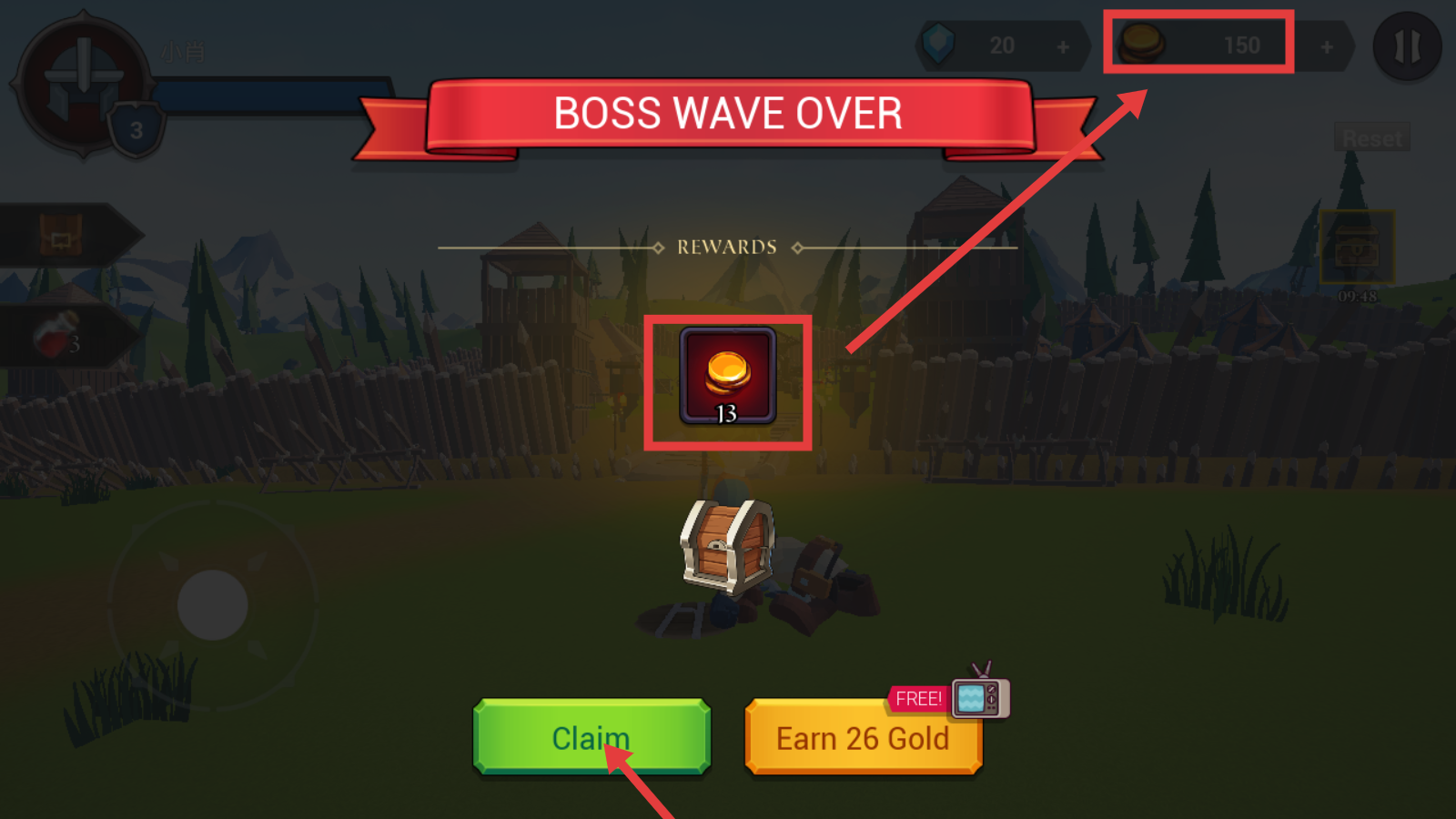 4、击败BOSS后,领取【13】金币奖励,总金币达【150】,点击【Claim】快速结算,积累资源强化角色。