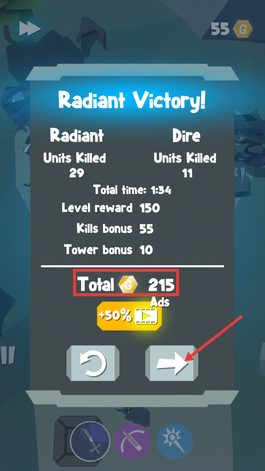 4、胜利后获取【Total-G-215】奖励,点击箭头按钮进入下一关,延续战斗优势推进关卡。