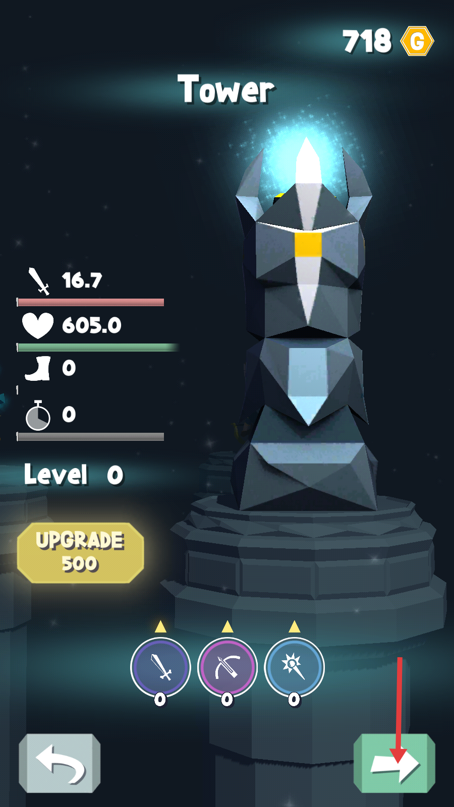 1、塔界面有【718-G】金币,点击【UPGRADE-500】升级,提升【16.7】攻击与【605.0】血量,强化防御核心。
