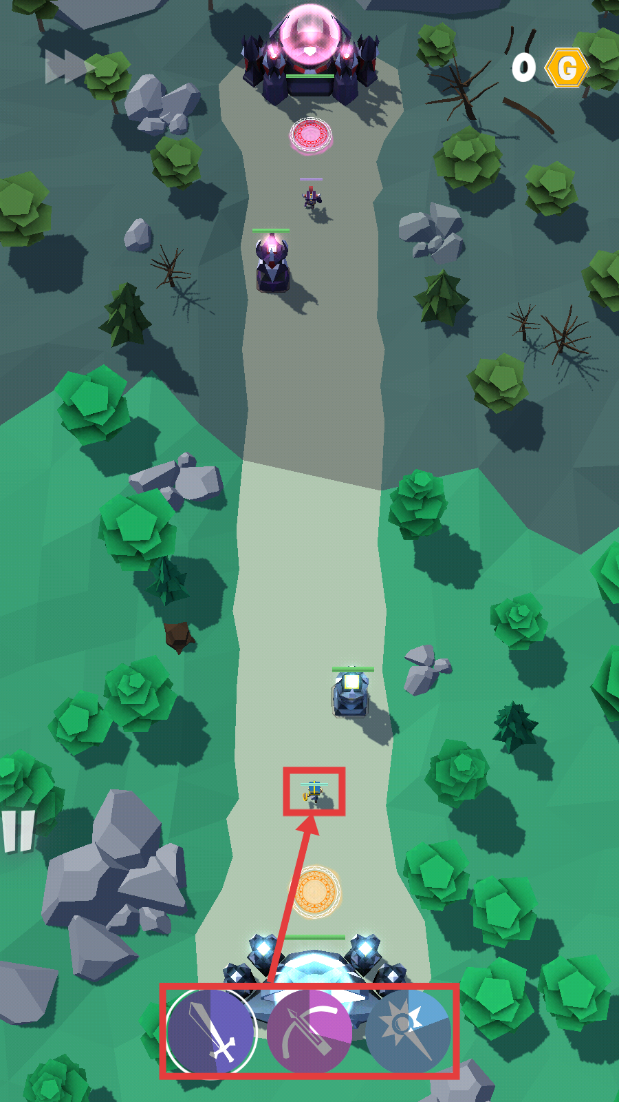 2、战斗时下方【剑-弓-星】技能按需释放,召唤单位部署在路径,拦截敌方进攻。