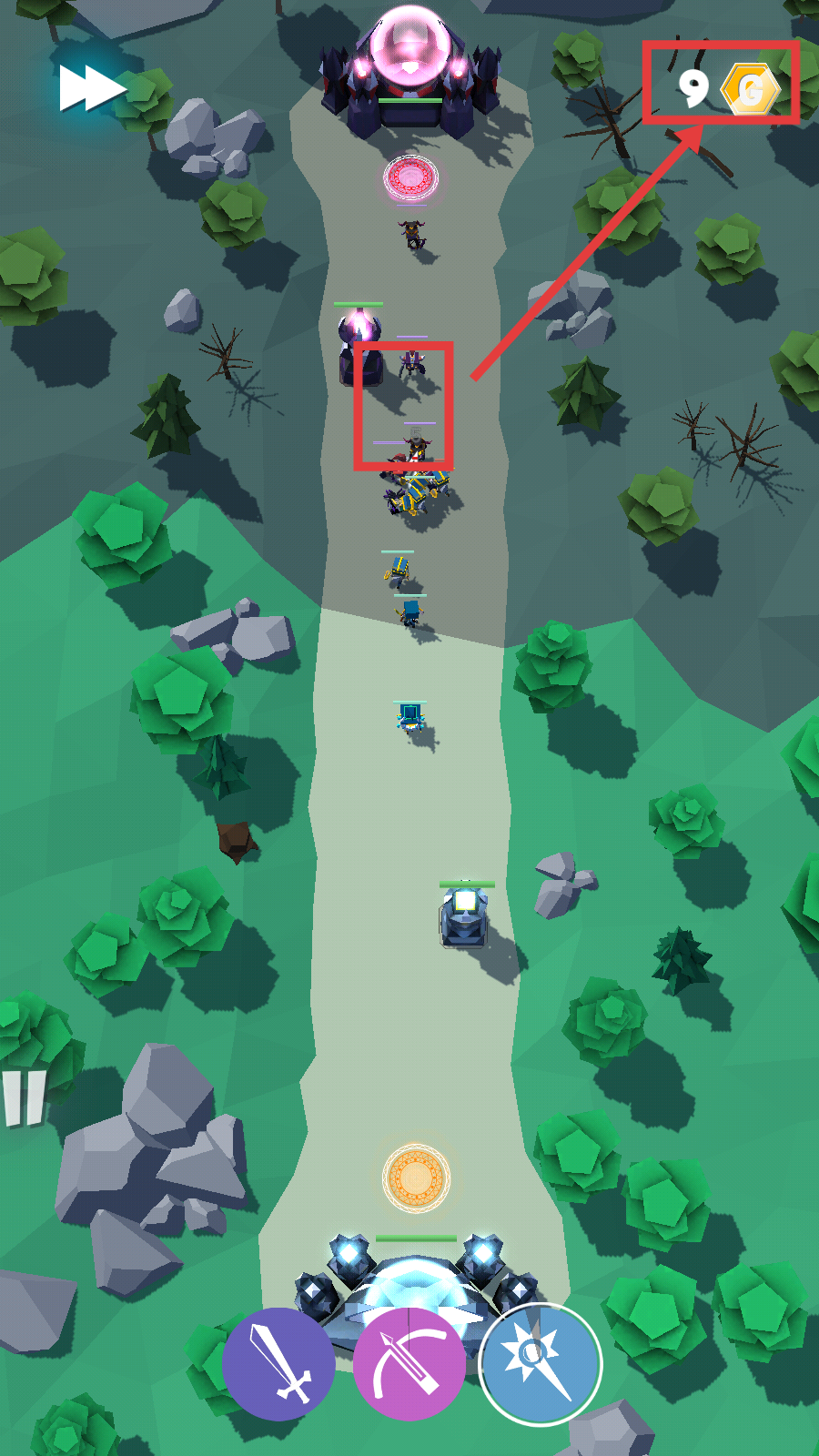 3、击败路径敌人,积累【9-G】等金币,及时回收资源,为塔升级或技能解锁攒素材。