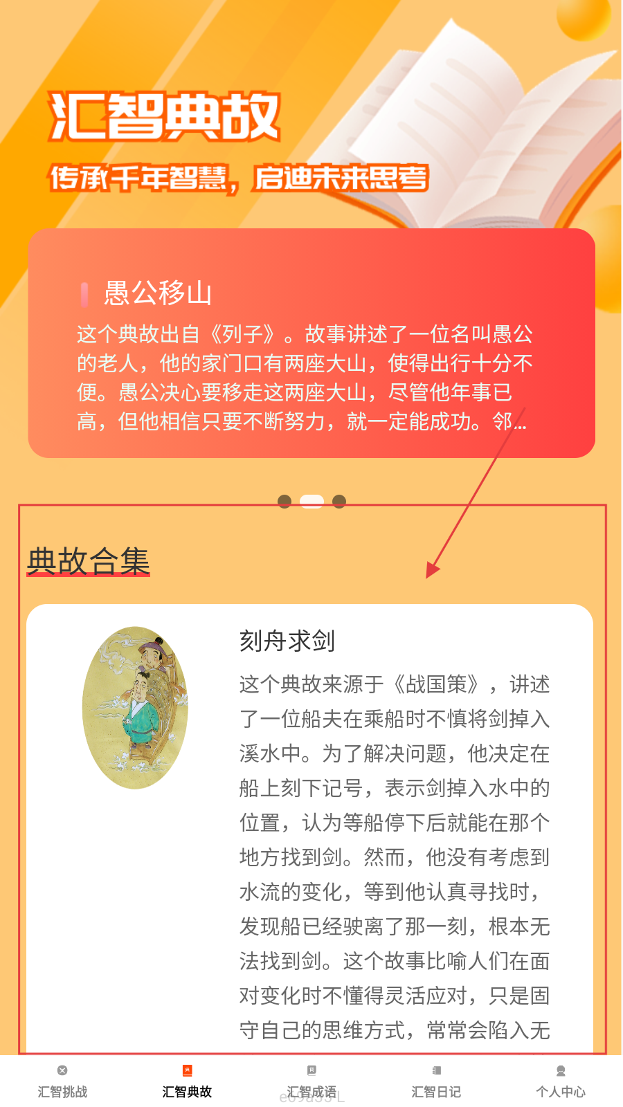 3、切换【汇智典故】,读愚公移山、刻舟求剑等典故,积累知识。