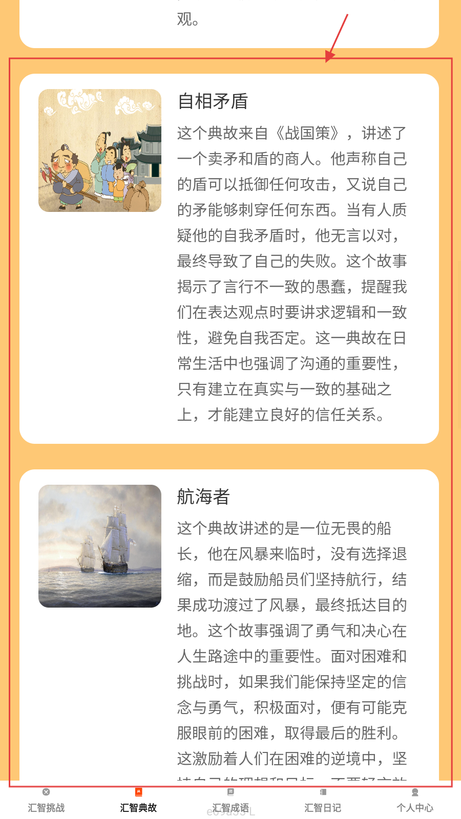4、向下滑动,继续浏览【典故合集】,了解自相矛盾、航海者故事,深化认知。