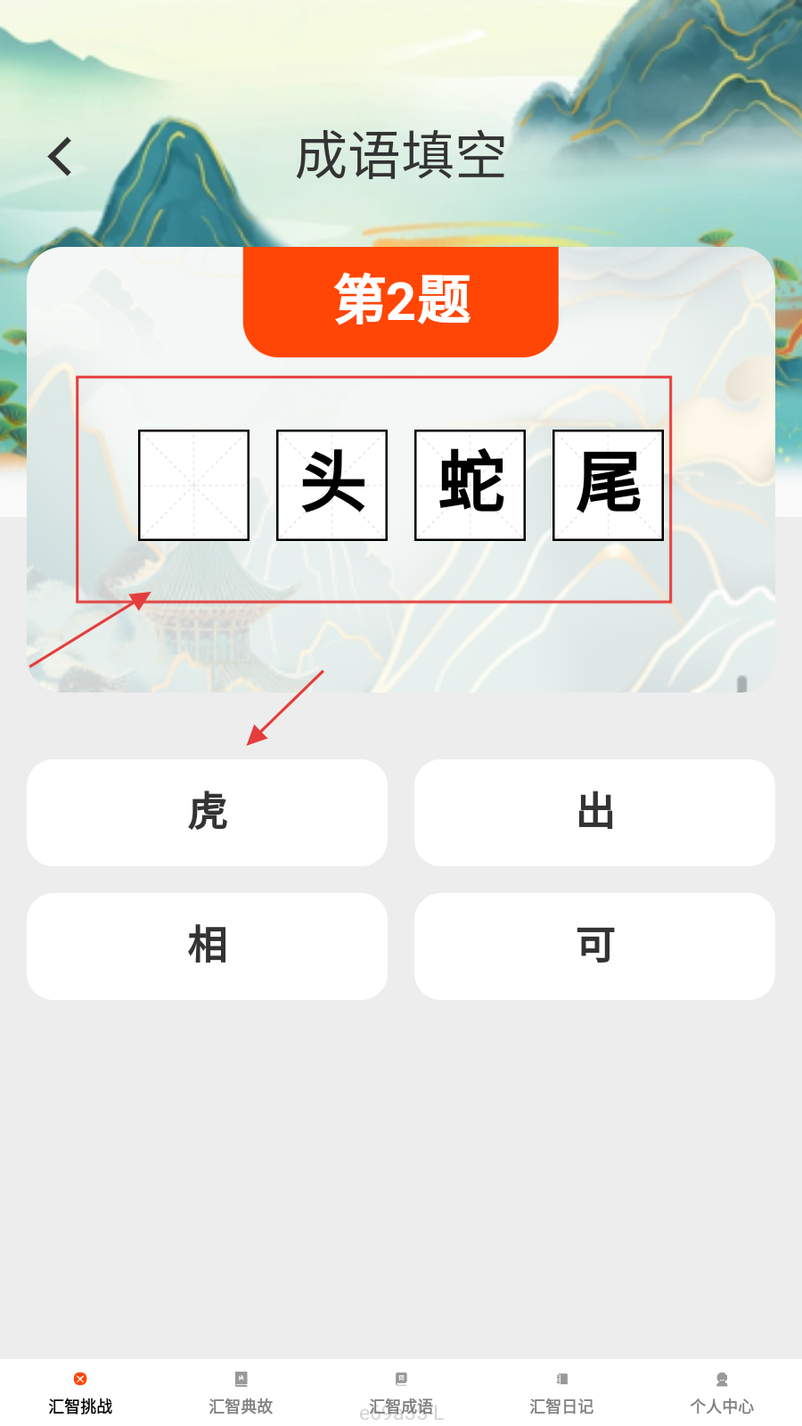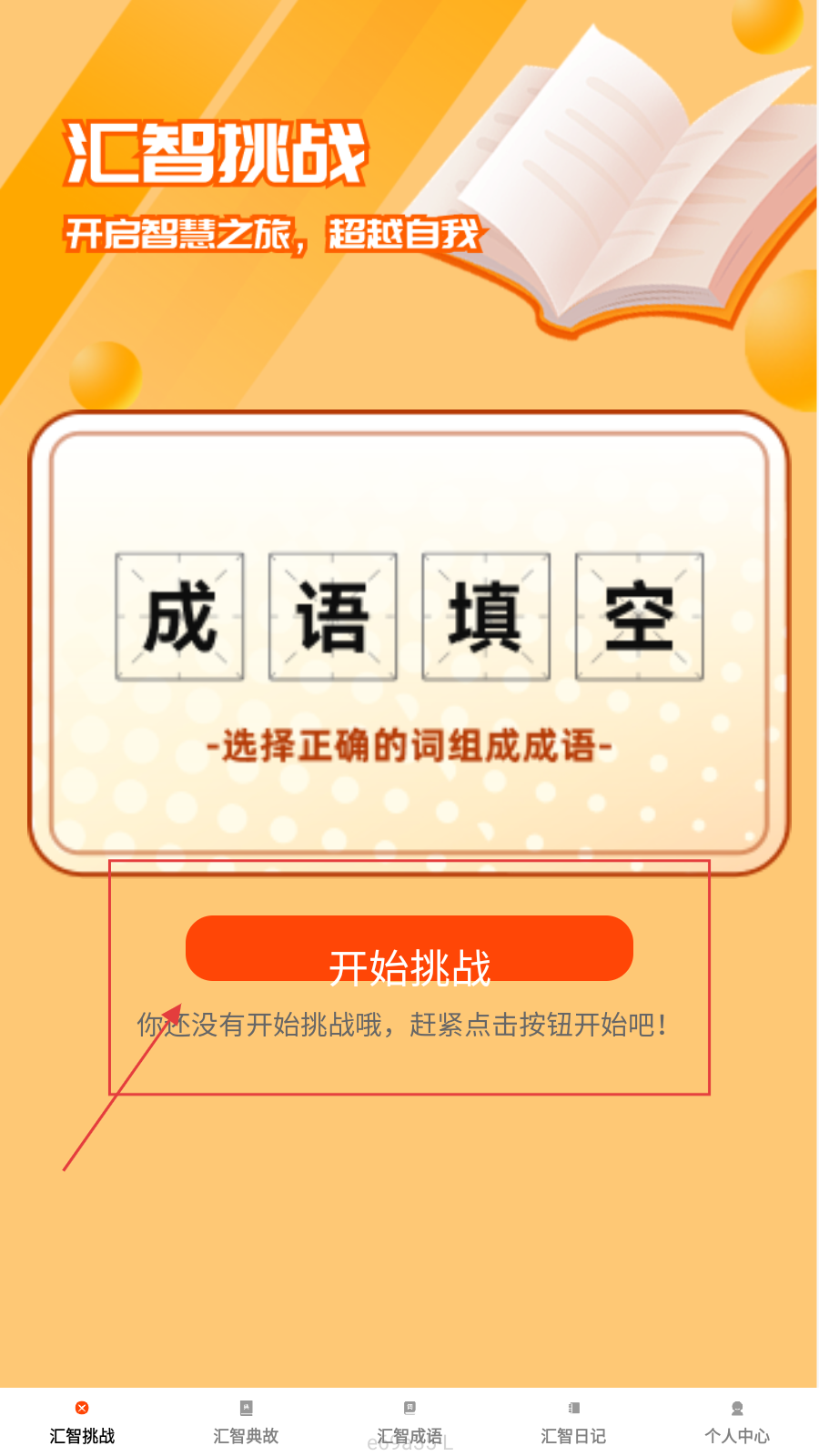 1、进入【汇智挑战】,选【成语填空】,点【开始挑战】,开启成语答题。