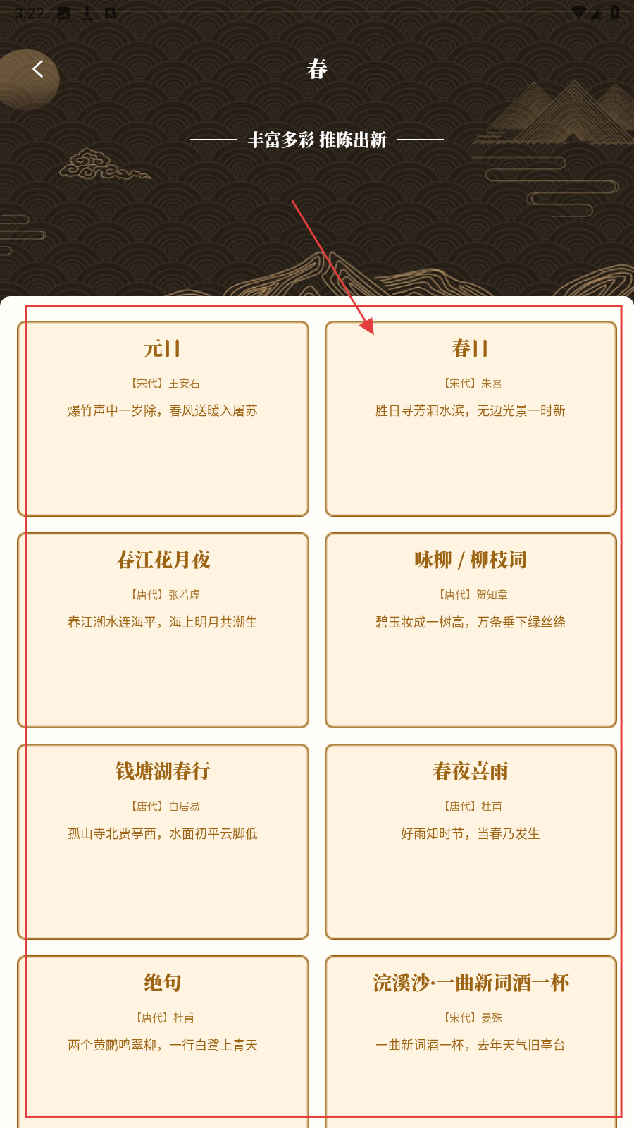 3、点【春日-朱熹】卡片,查看诗词原文,感受春日意境。