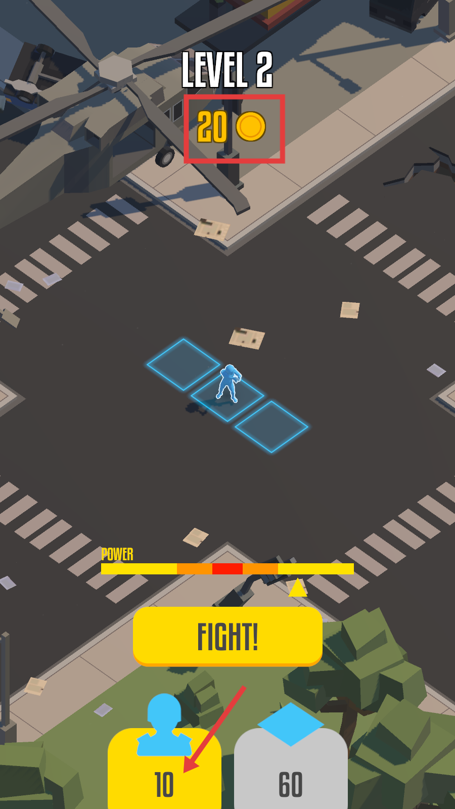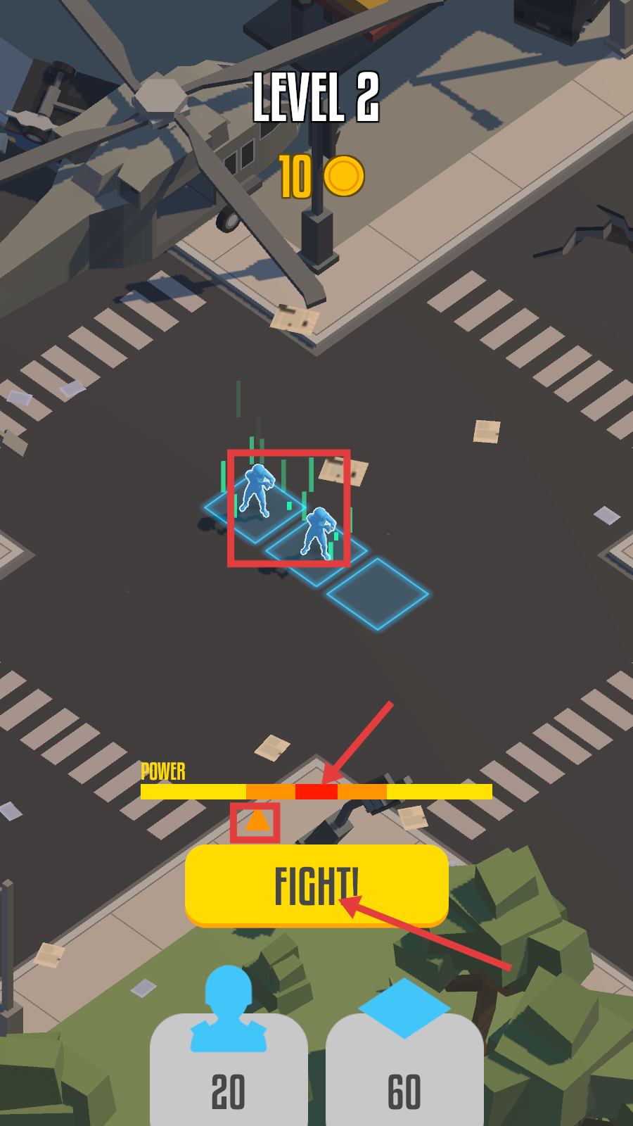 2、叠加部署单位(如双士兵),消耗金币后,点击【FIGHT!】触发战斗,关注上方POWER条变化。