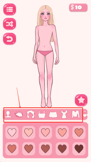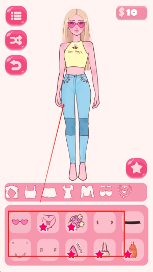 2、挑选服装饰品:从大量服饰中挑选心仪单品,搭配美妆道具打造妆容,按个人审美组合穿搭,调整细节让造型更协调美观。