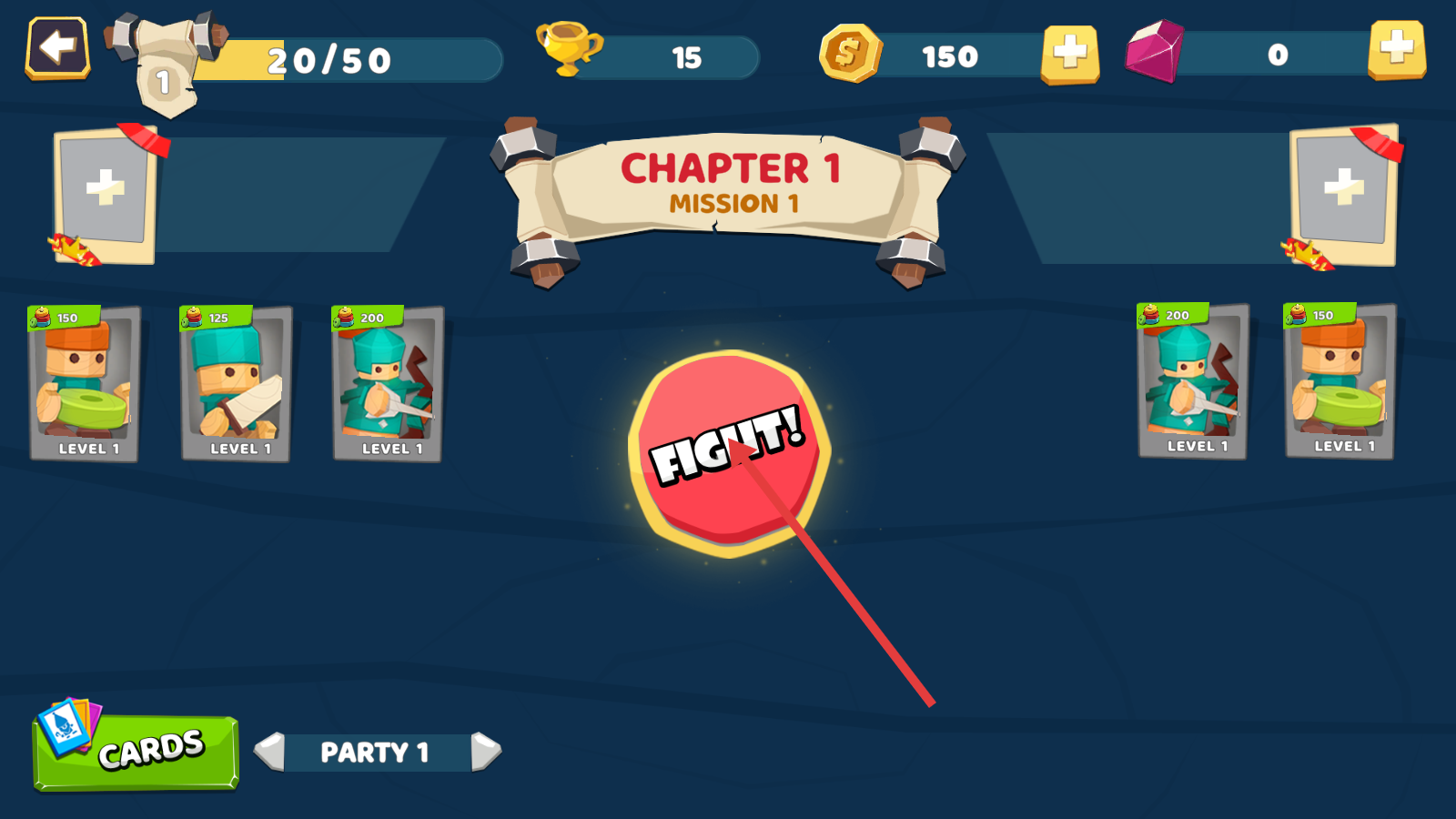1、进入【CHAPTER-1-MISSION-1】界面,确认【PARTY-1】阵容后,点击【FIGHT!】开启首章战斗。