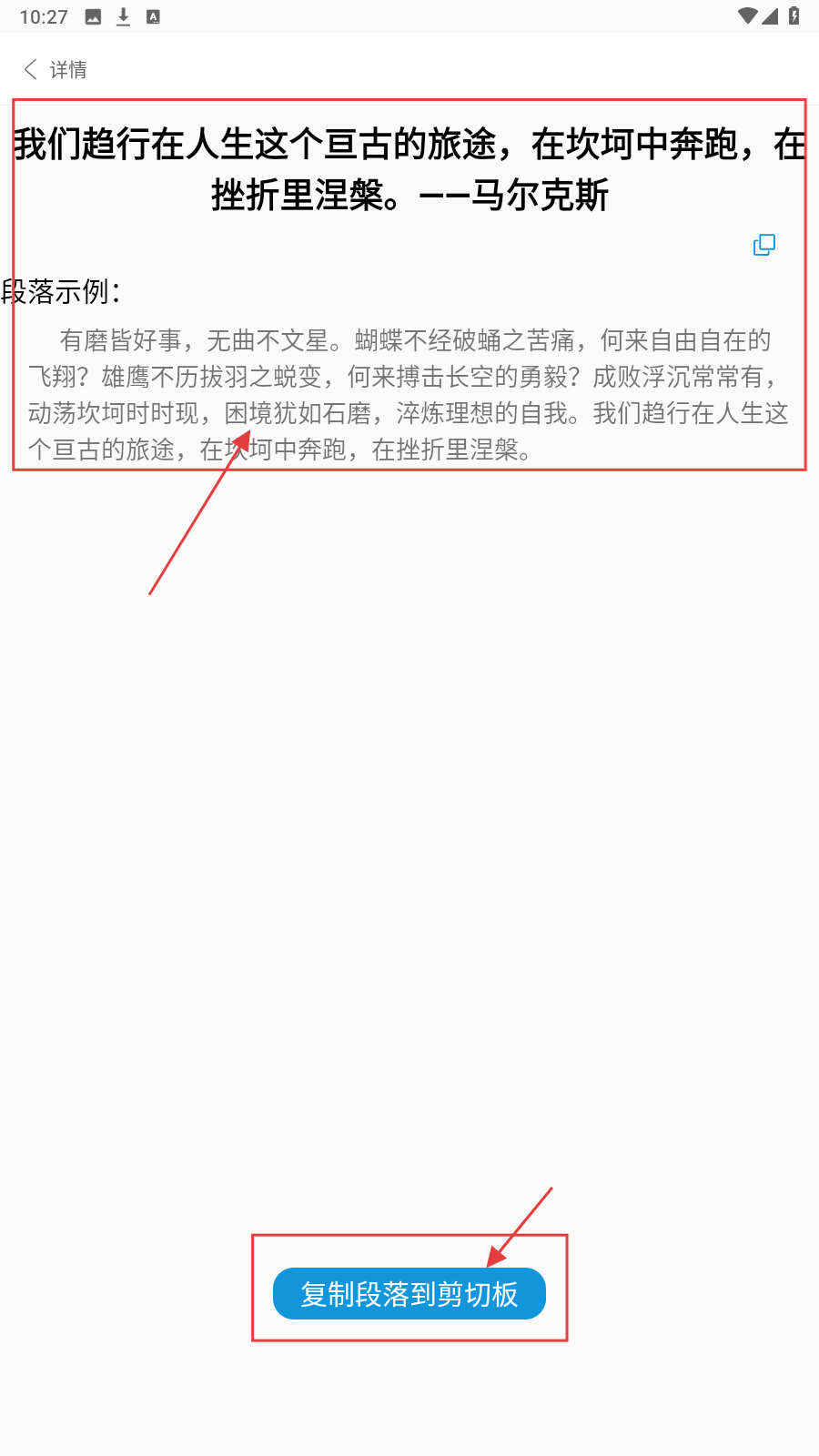 2、进入好句详情页,查看完整内容,如若喜欢可以点击【复制段落到剪切板】进行收藏。