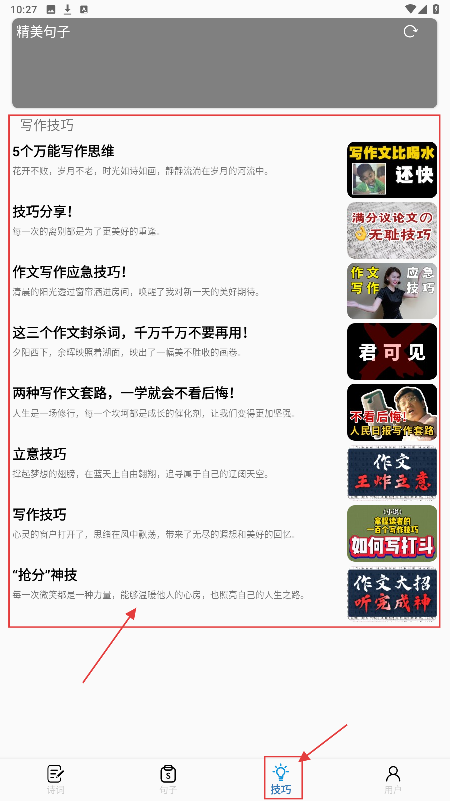 3、点击下方【技巧】按钮切换页面,浏览写作技巧文章,选择心仪的文章进入学习。