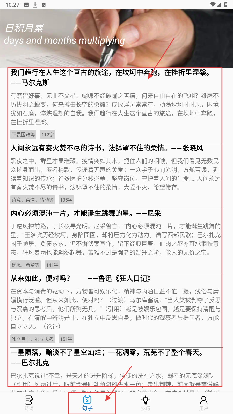 1、打开应用,在【句子】页面,浏览好句列表,选择感兴趣的句子点击进入。