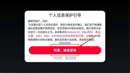 2、同意隐私政策:阅读“个人信息保护引导”,确认无误后点击“同意,继续使用”,即可继续游戏。