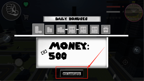 4、领取每日奖金:在“DAILY BONUSES”界面点击“CONEUNUE”,获得500金币并返回主界面。