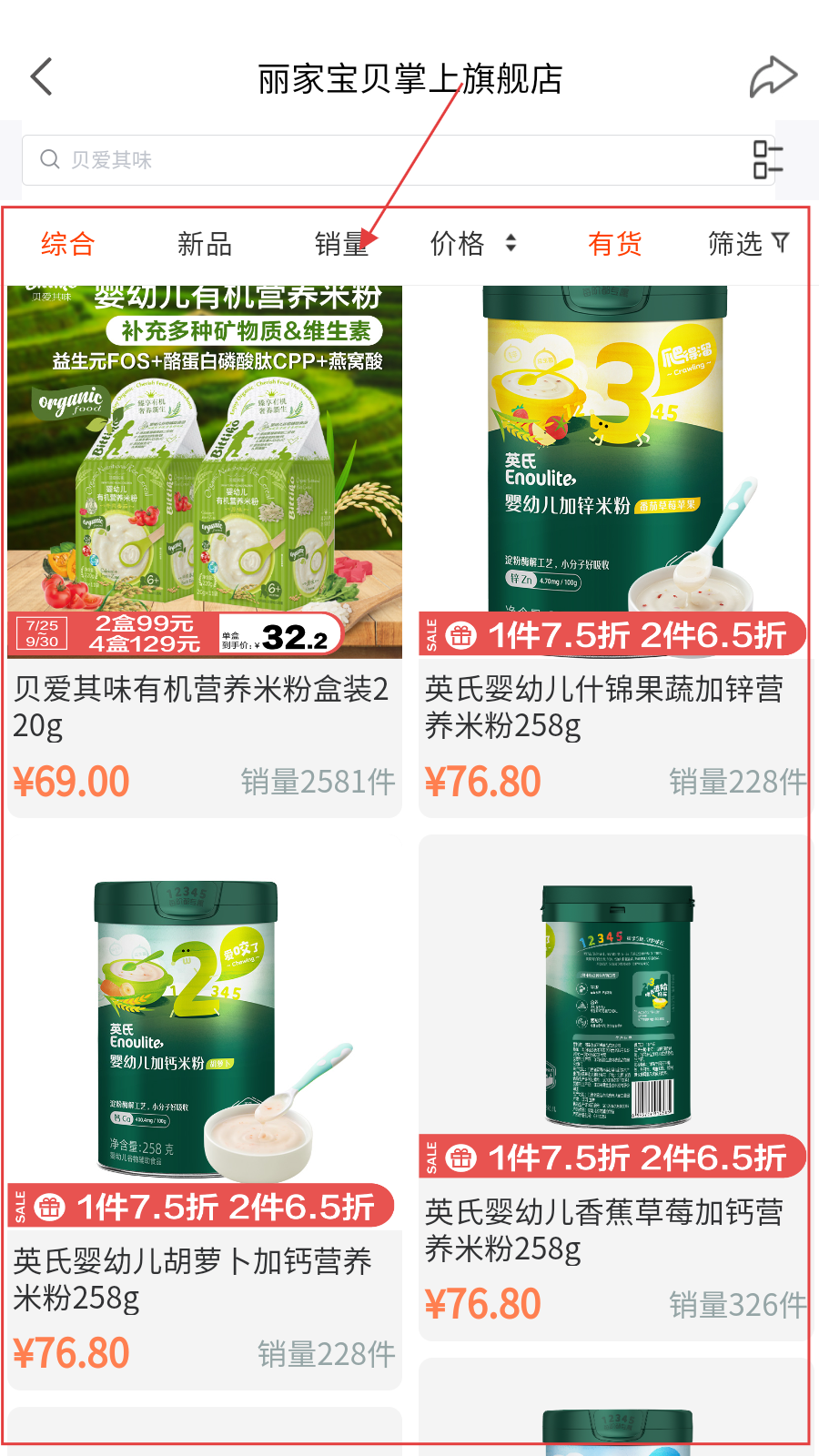 2、在商品列表,点【销量】排序,优先看热销的贝爱其味、英氏米粉。