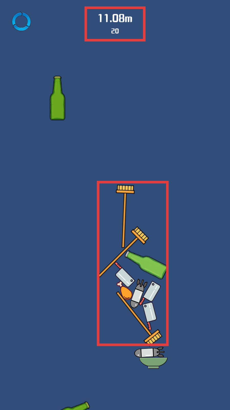 2、待【绿色方块】下落,调整位置让红框承接扫帚与炸弹,助力碗上方收集进程。