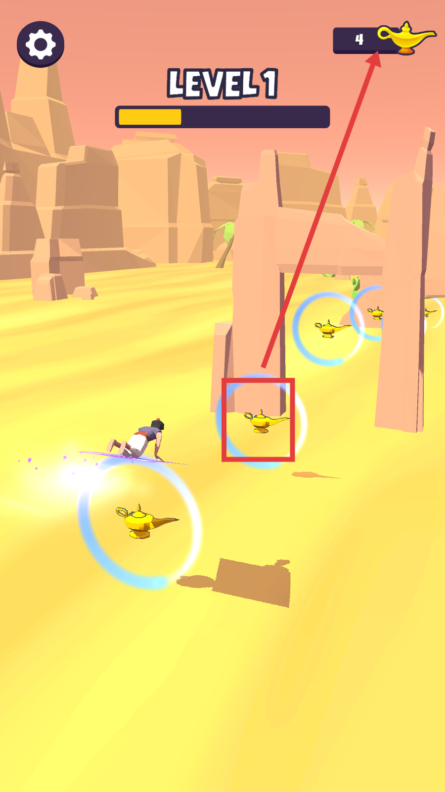 2、在【LEVEL-1】关卡中,持续采集蓝色光环内的【神灯】,提升右上角计数,同时规避场景障碍。