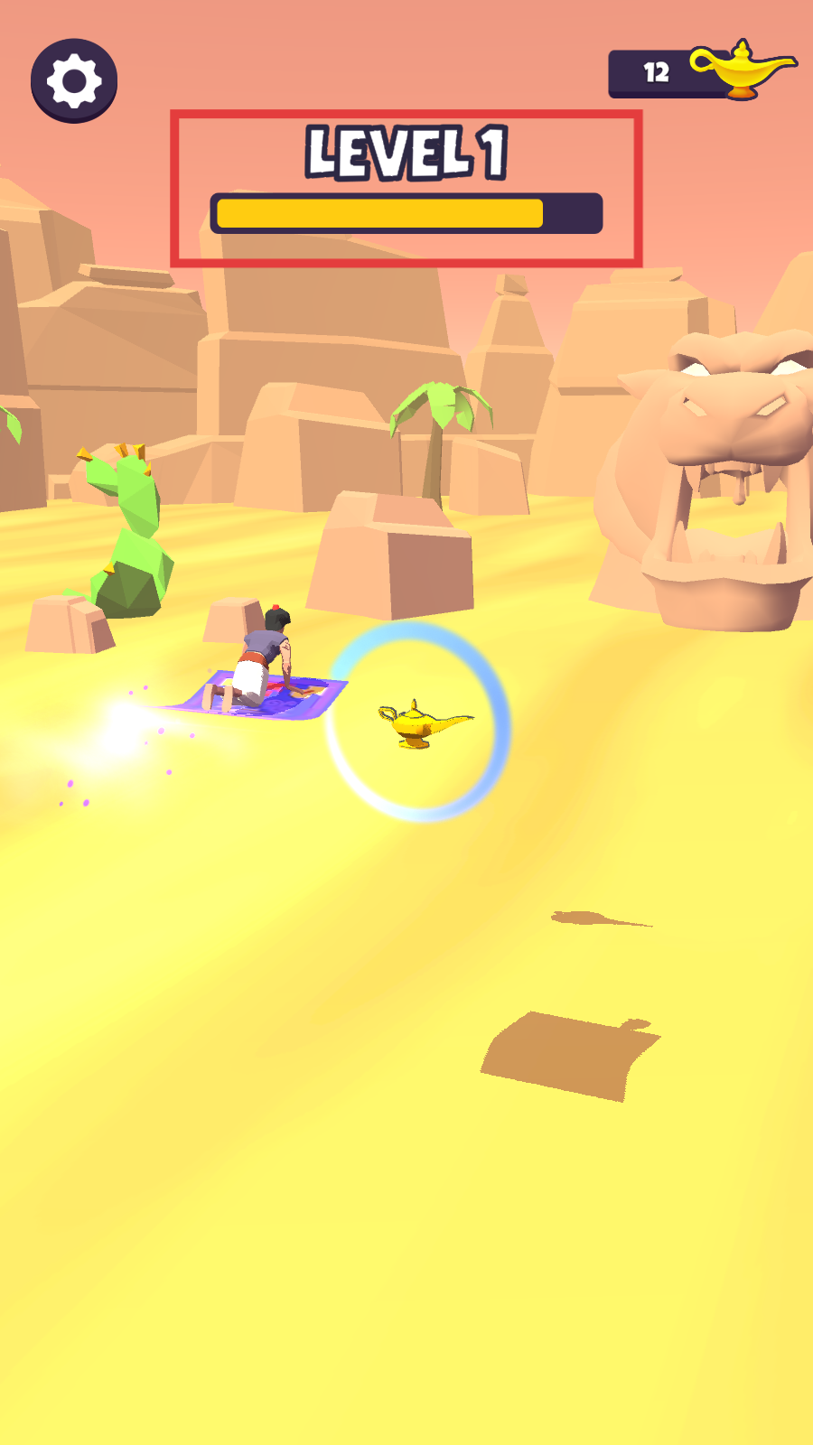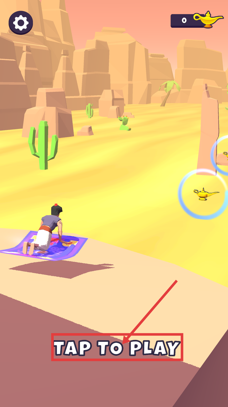 1、点击【TAP-TO-PLAY】开启游戏,操控飞毯在沙漠移动,优先收集发光【神灯】,开启冒险旅程。