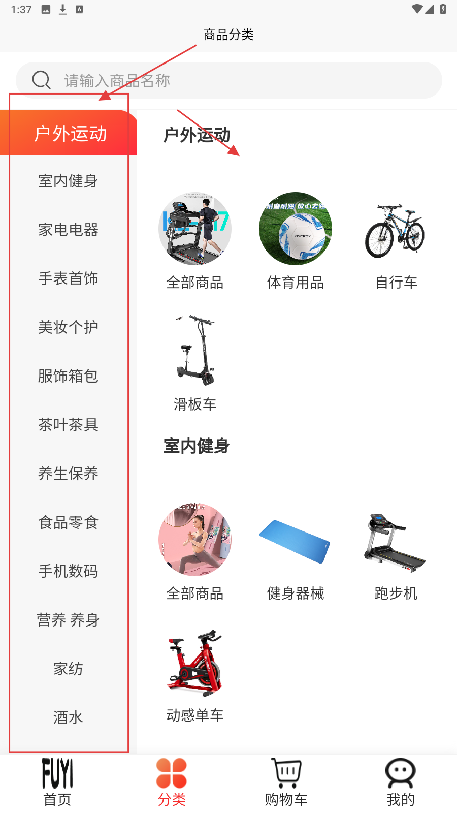 4、切换【分类】页,选户外运动、室内健身等分类,精准找心仪商品。