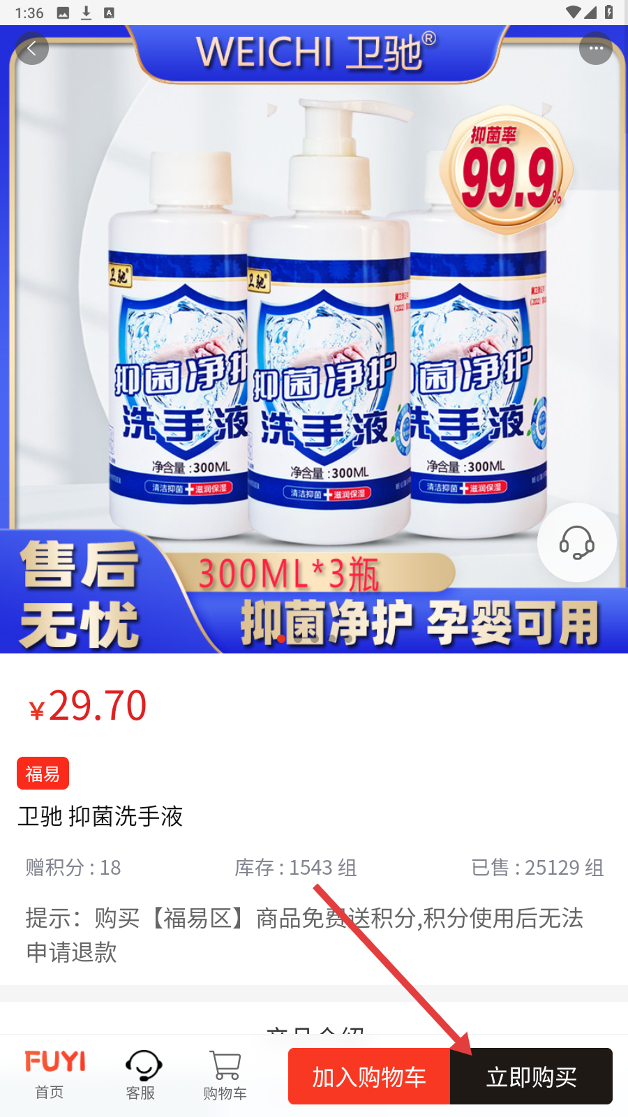 3、进入商品详情,确认卫驰洗手液规格、库存,点【立即购买】下单。