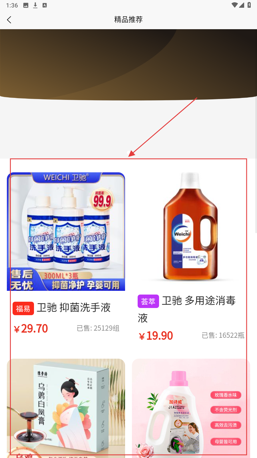 2、在【精品推荐】页,挑选卫驰洗手液等商品,查看价格与销量。