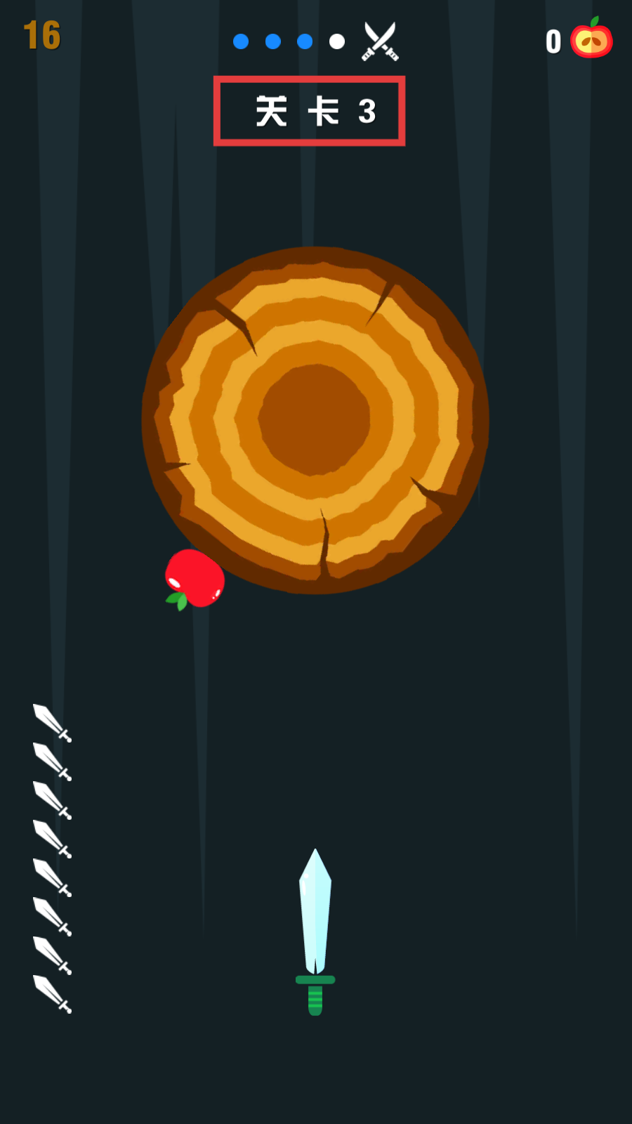 4、挑战【关卡3】时留意树桩旁的苹果,发射飞刀时尝试命中苹果,可获取额外奖励或分数加成。