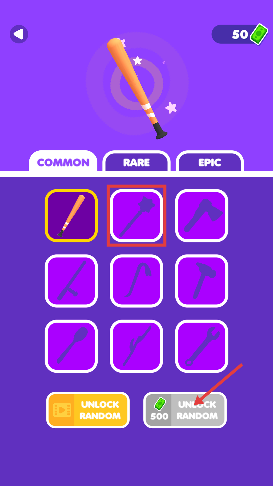2、积累金币至500,点击【UNLOCK-RANDOM】,解锁RARE级武器,提升战斗能力。