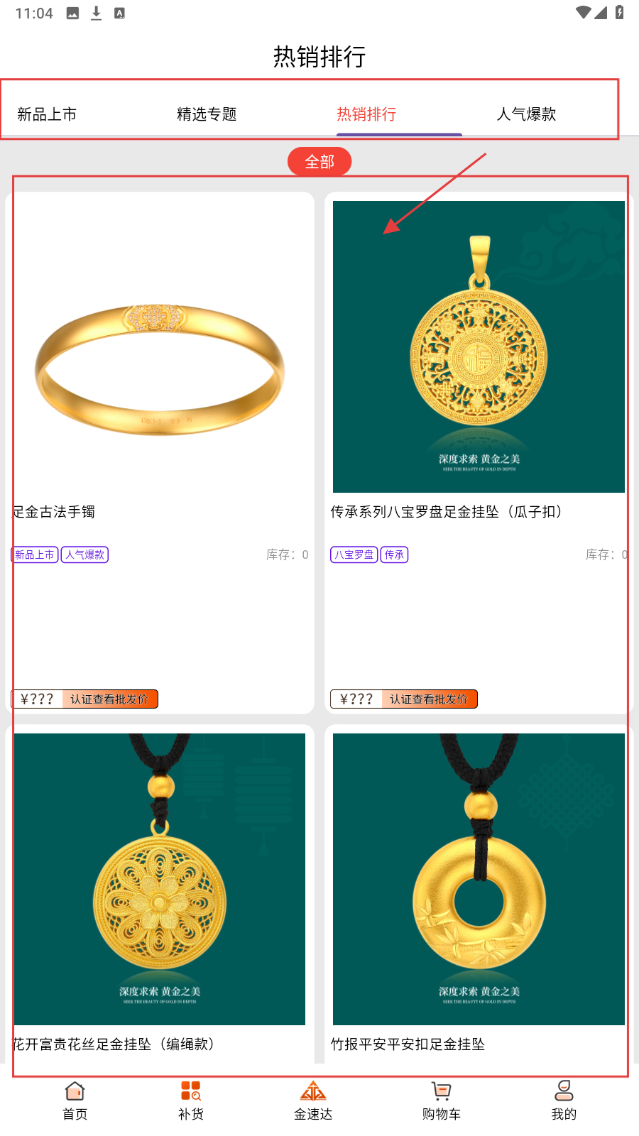 3、还可以切换到【补货】页面,有新品上市、精选专题等分类,按需选择,如点击【热销排行】。