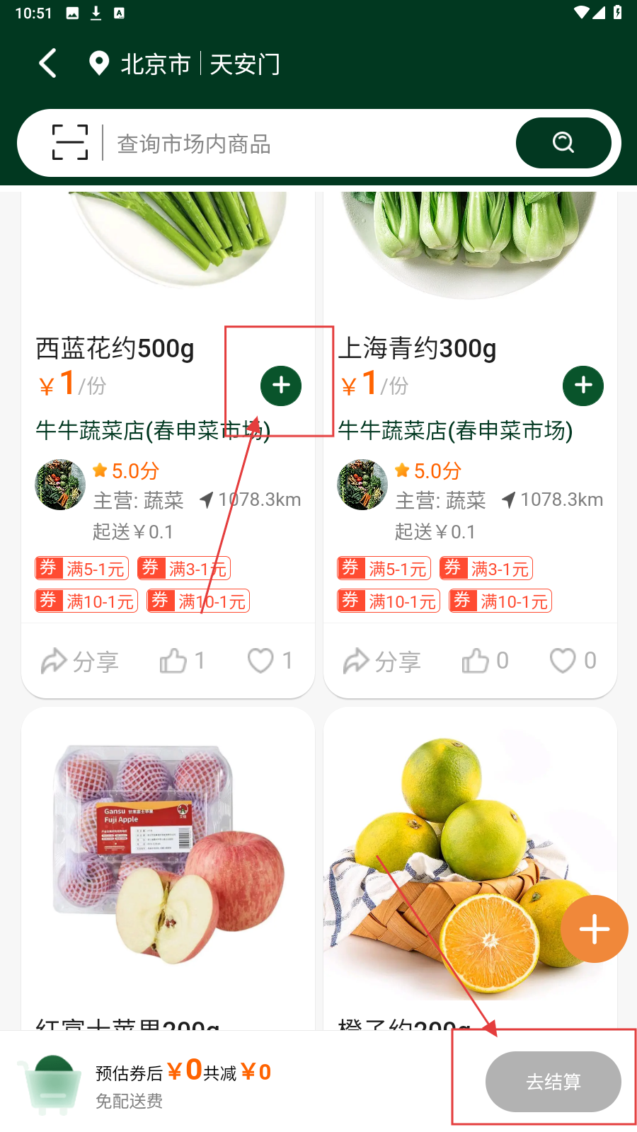 4、选择要购买的商品,点击【 】按钮加入购物车,选购完成点击【去结算】即可下单。