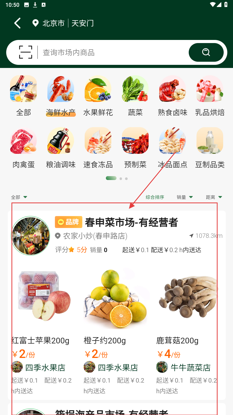 1、打开应用,在分类栏中选择要购买的商品分类标签,如点击【海鲜水产】。