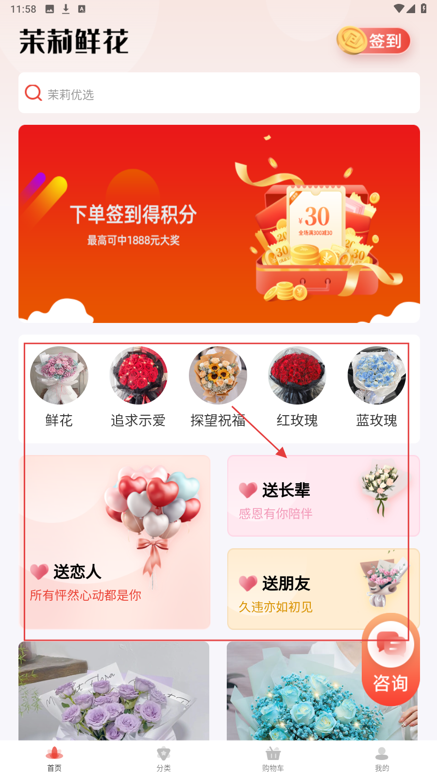 1、进入【茉莉鲜花】首页,选送长辈等场景,快速定位适配花束品类。