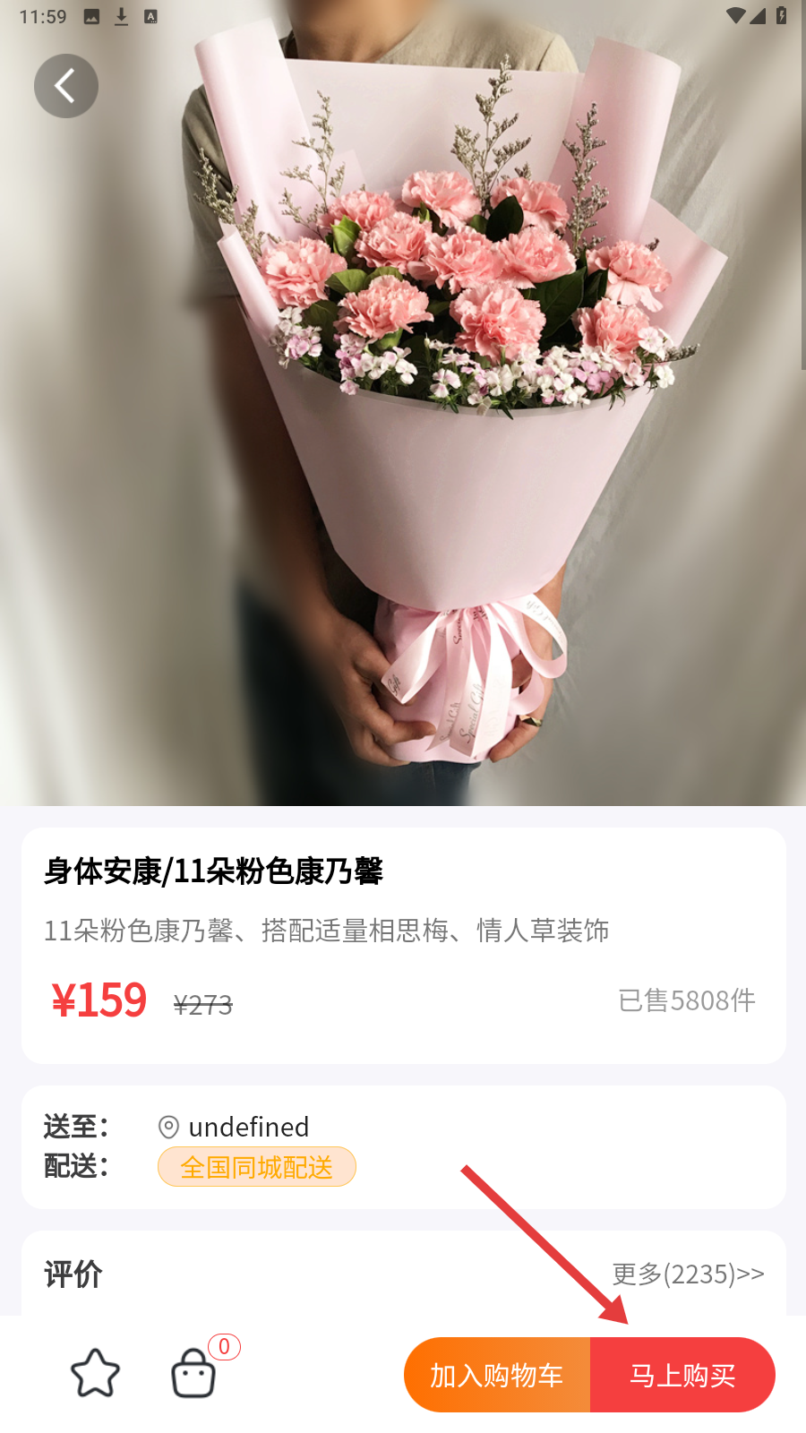 3、查看商品详情,确认花束信息后,点【马上购买】启动下单流程。