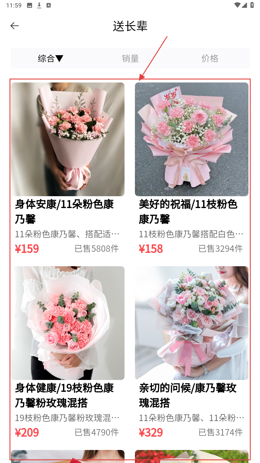 2、在【送长辈】列表,对比不同花束价格、销量,筛选心仪商品。
