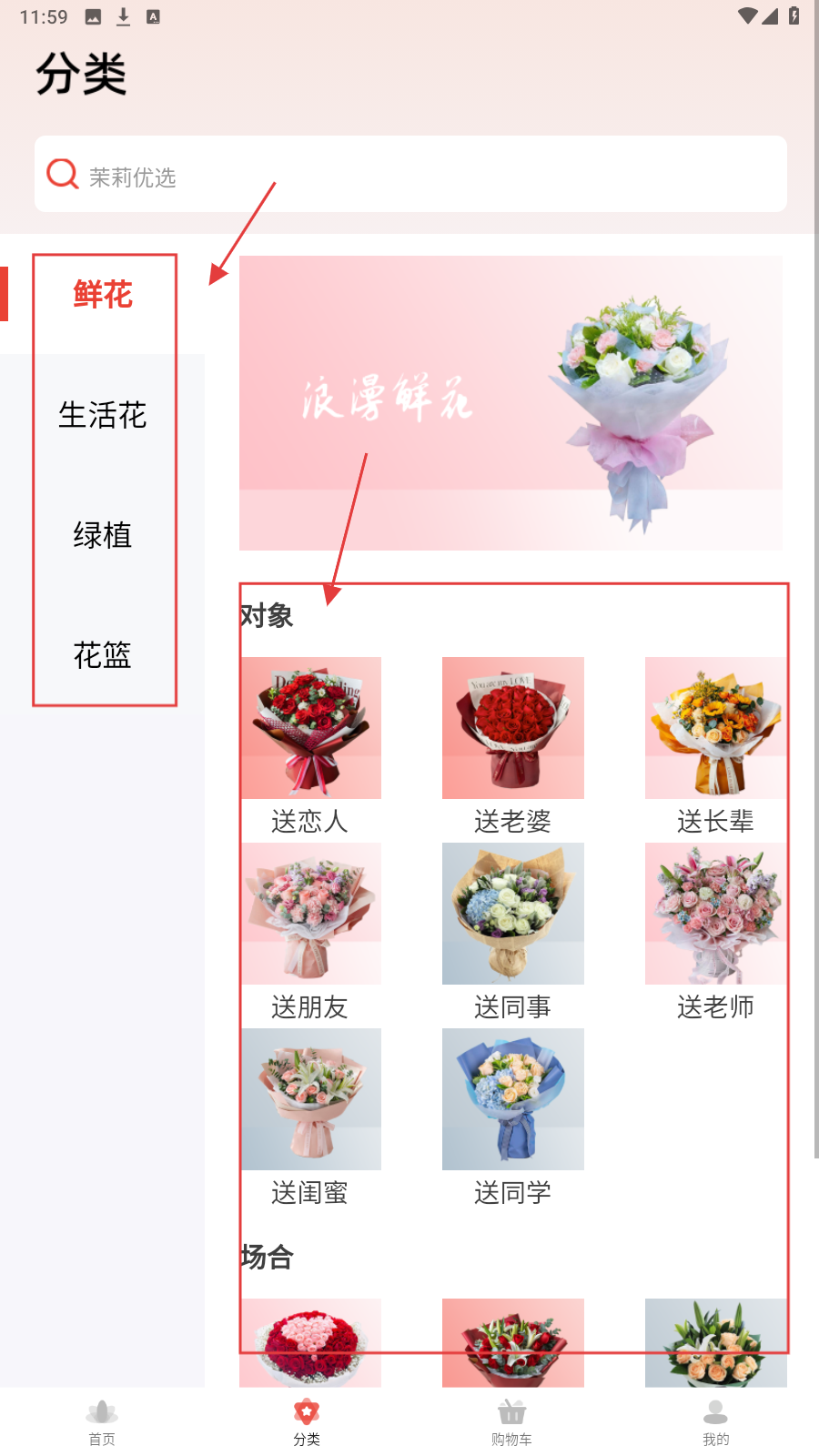 4、还可以切换至【分类】页选鲜花,按送恋人等对象分类,精准找对应花束选购。