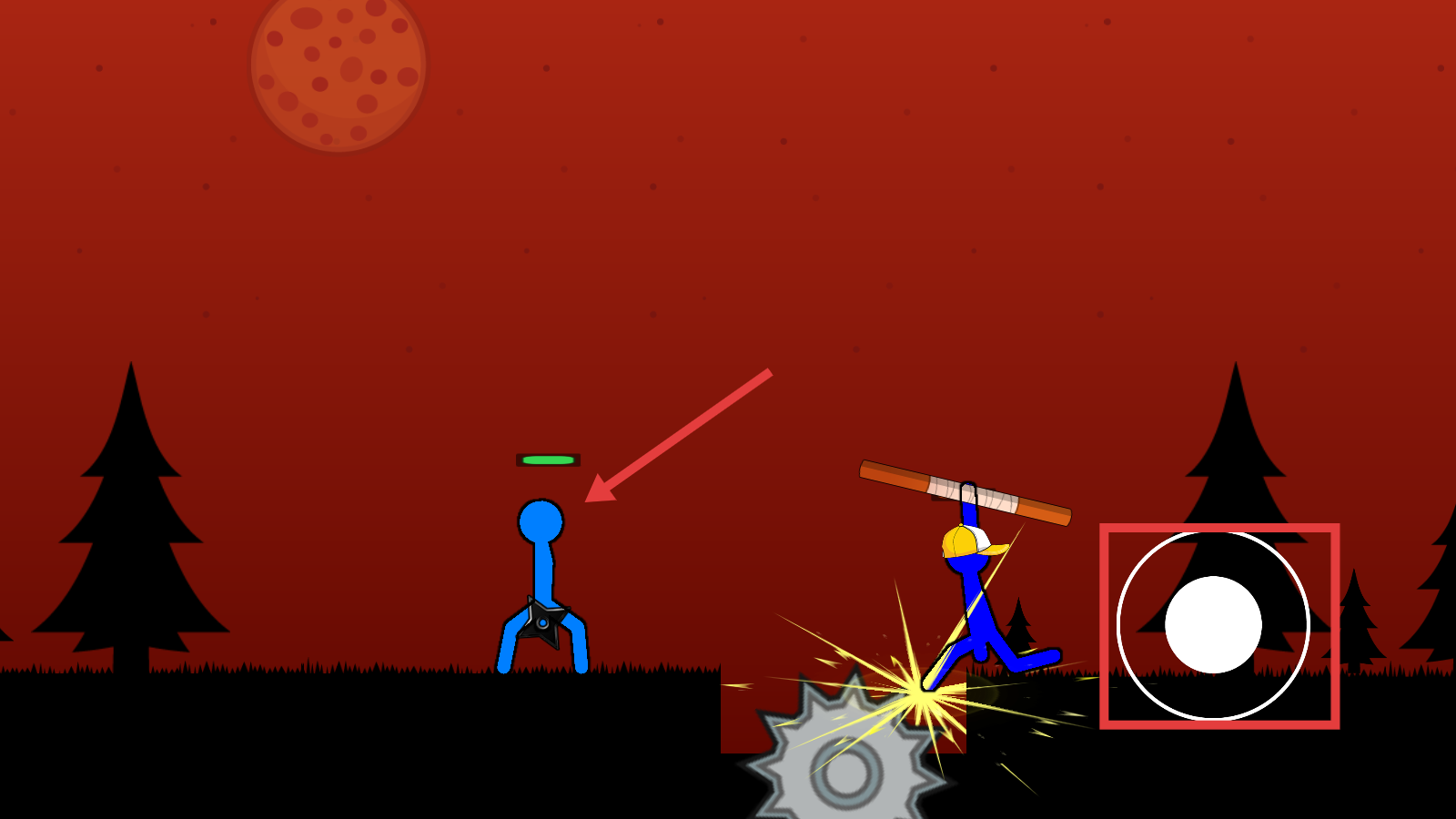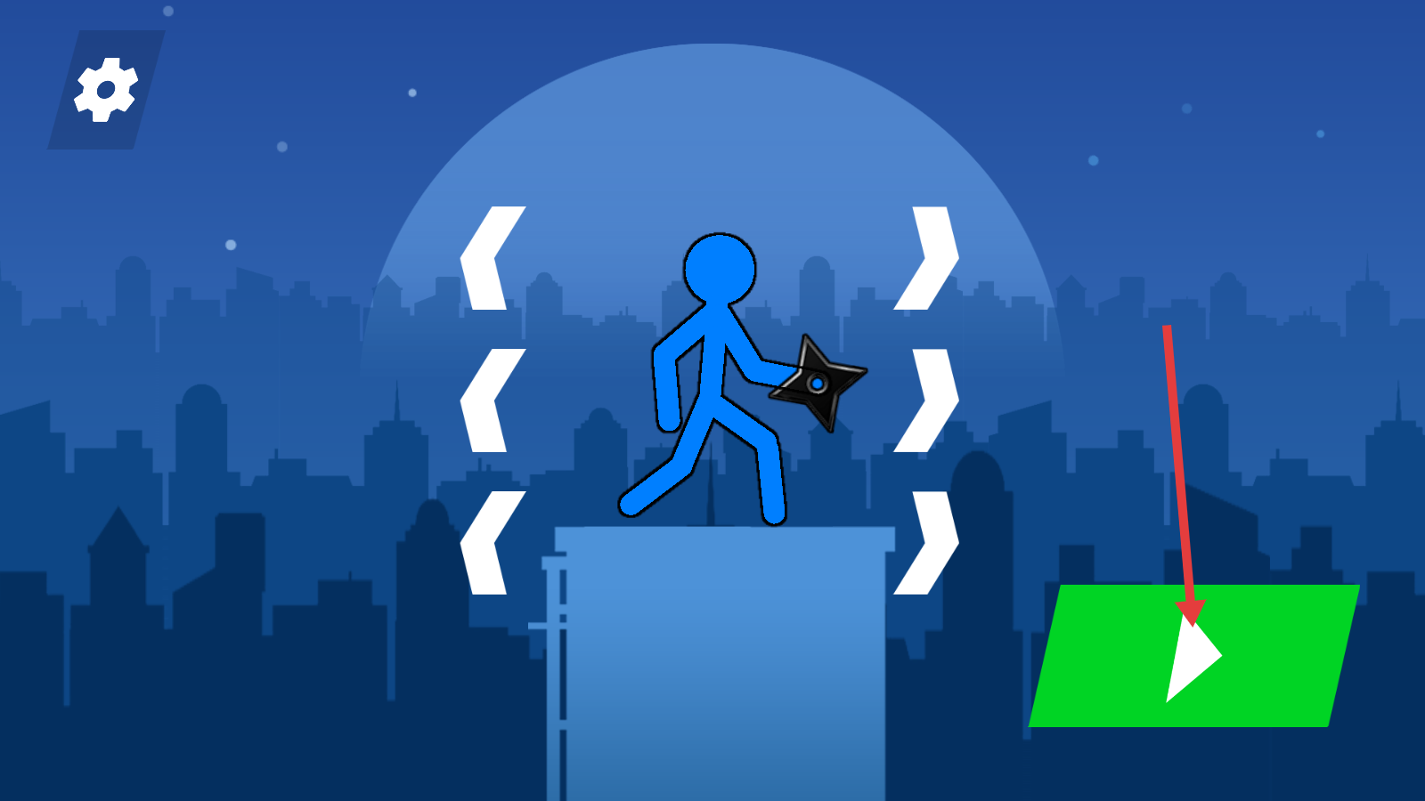 1、操控蓝色火柴人,从高楼跃向【绿色区域】,携带【飞镖】备战,熟悉场景衔接操作。