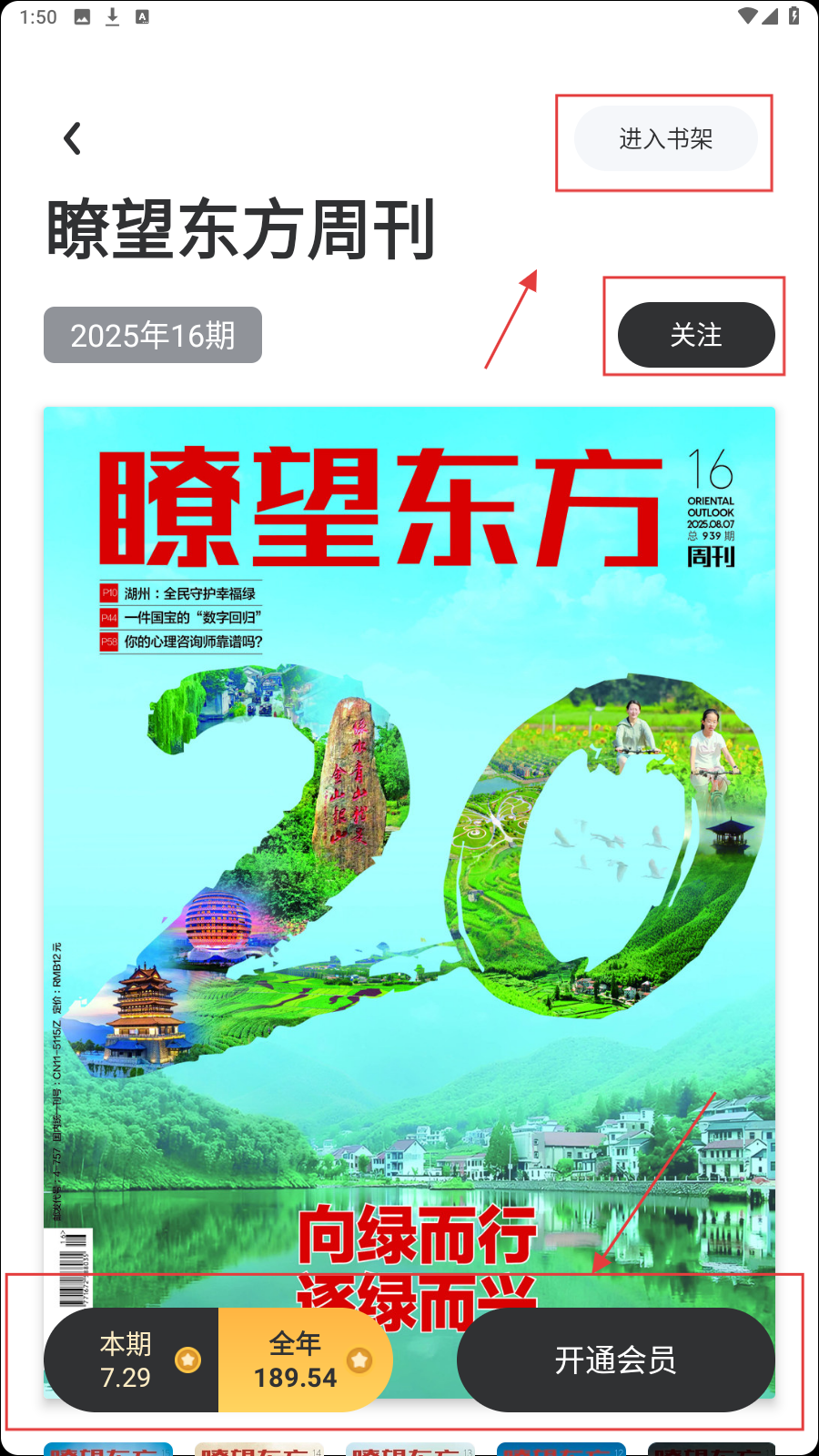 4、回到阅读区,选期刊,对喜欢的期刊点【关注】,还可按需【开通会员】享更多阅读权益。