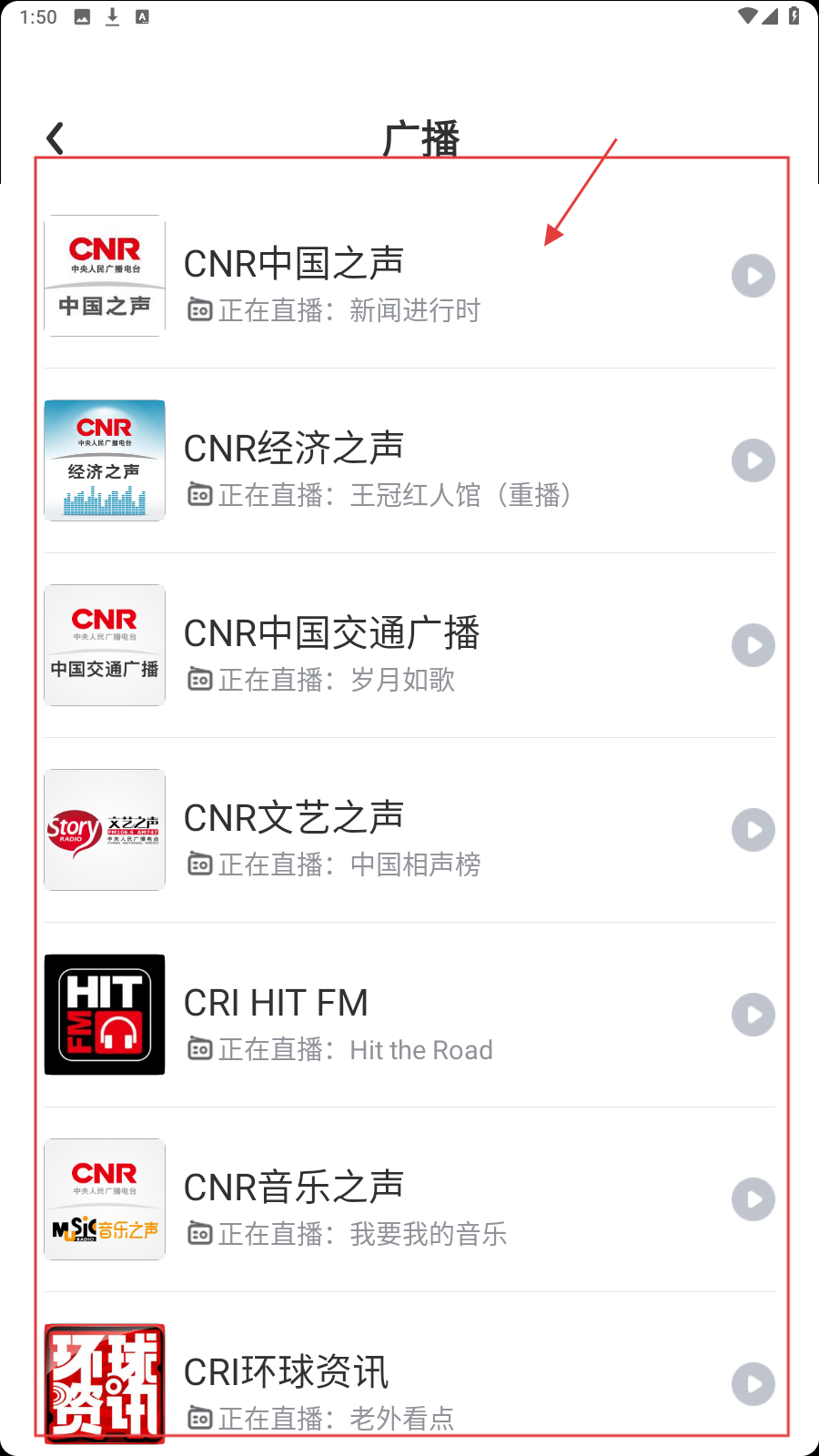 2、在广播列表,选目标电台(如CNR中国之声),进入播放界面。