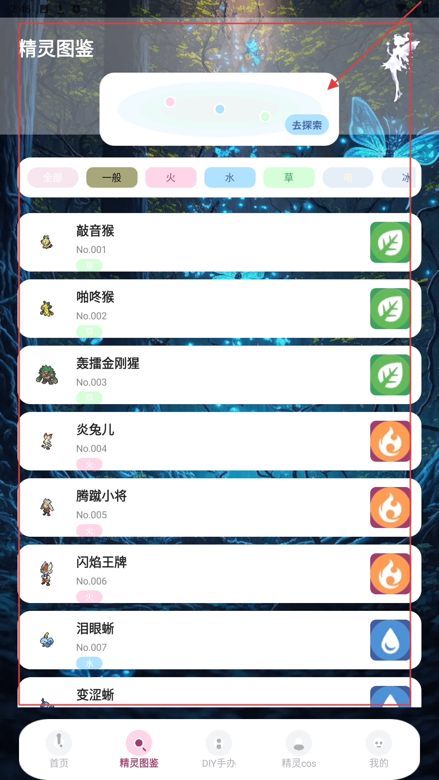 4、切换【精灵图鉴】,浏览敲音猴等精灵,点【去探索】解锁更多精灵。
