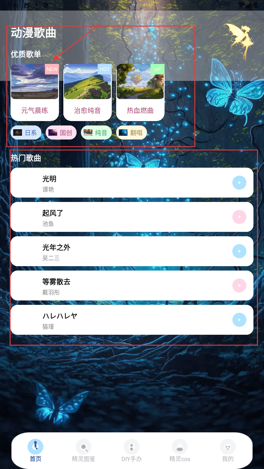 1、首页【动漫歌曲】区,选【元气晨练】等优质歌单,开启音乐之旅。