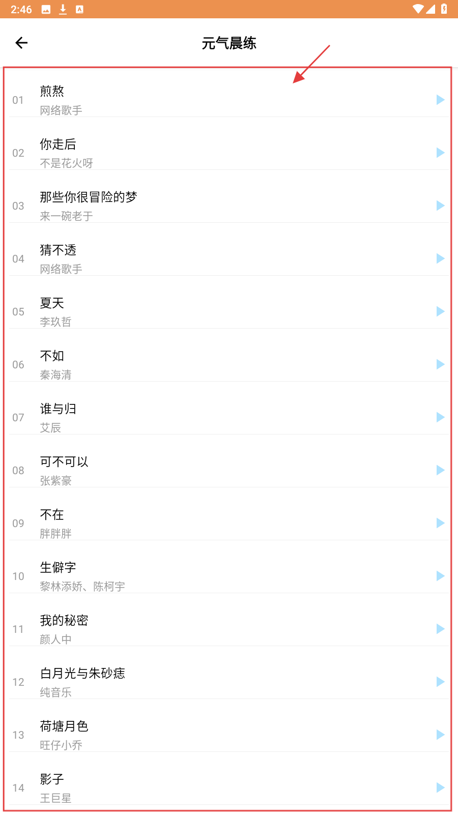 2、进入【元气晨练】歌单,点击歌曲(如《煎熬》),即可开始播放。