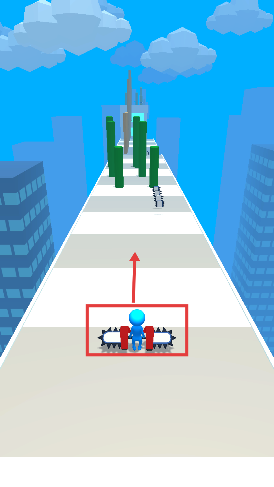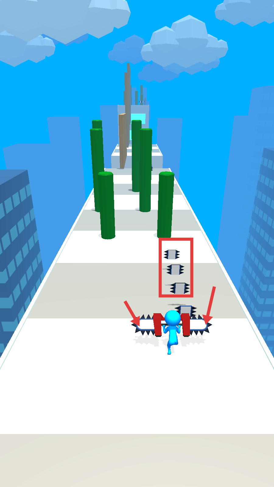 1、起步时操控角色利用【带刺装置】,沿箭头方向前进,避开前方绿色障碍柱。