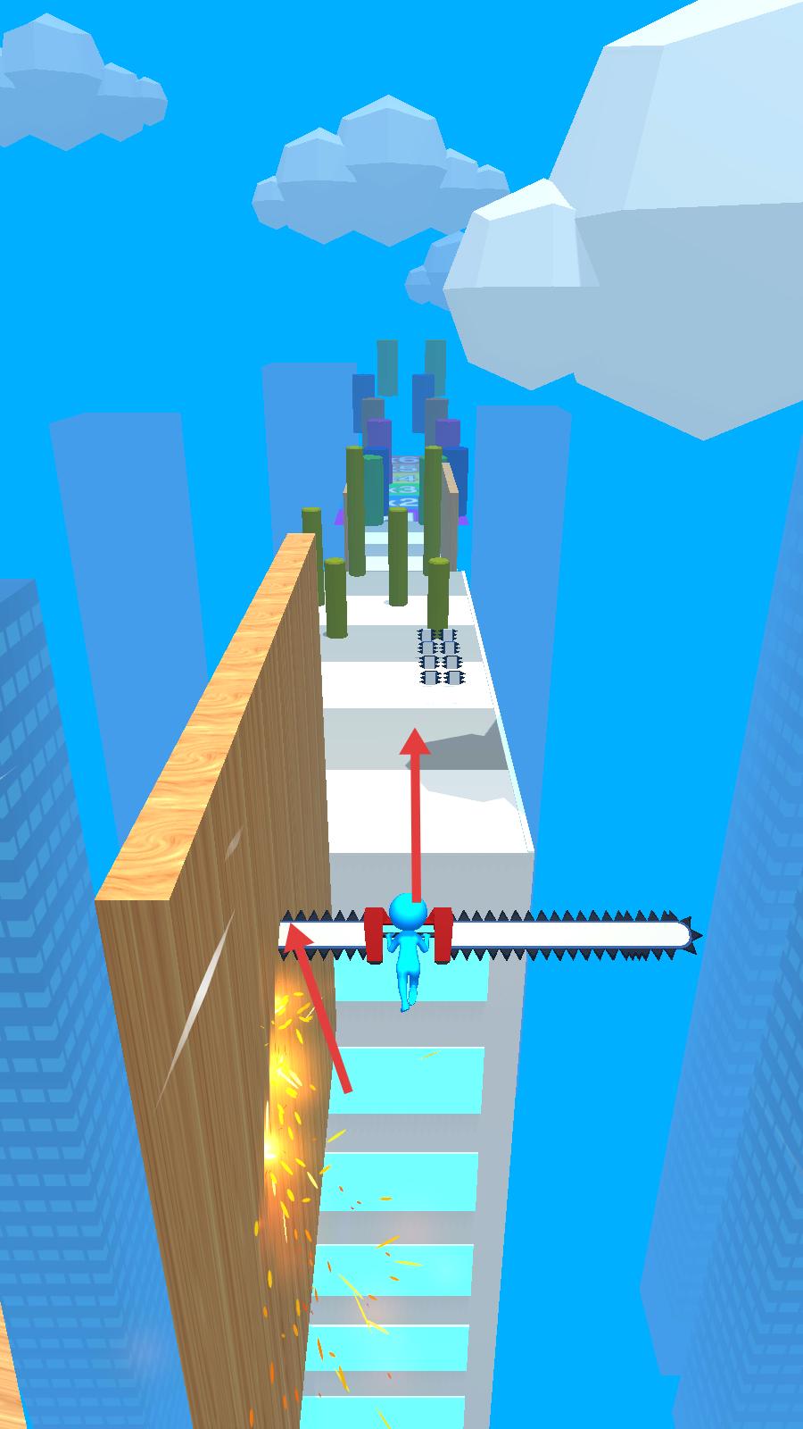 3、操控角色用【带刺装置】切割左侧木板,清除路障后沿箭头方向推进。