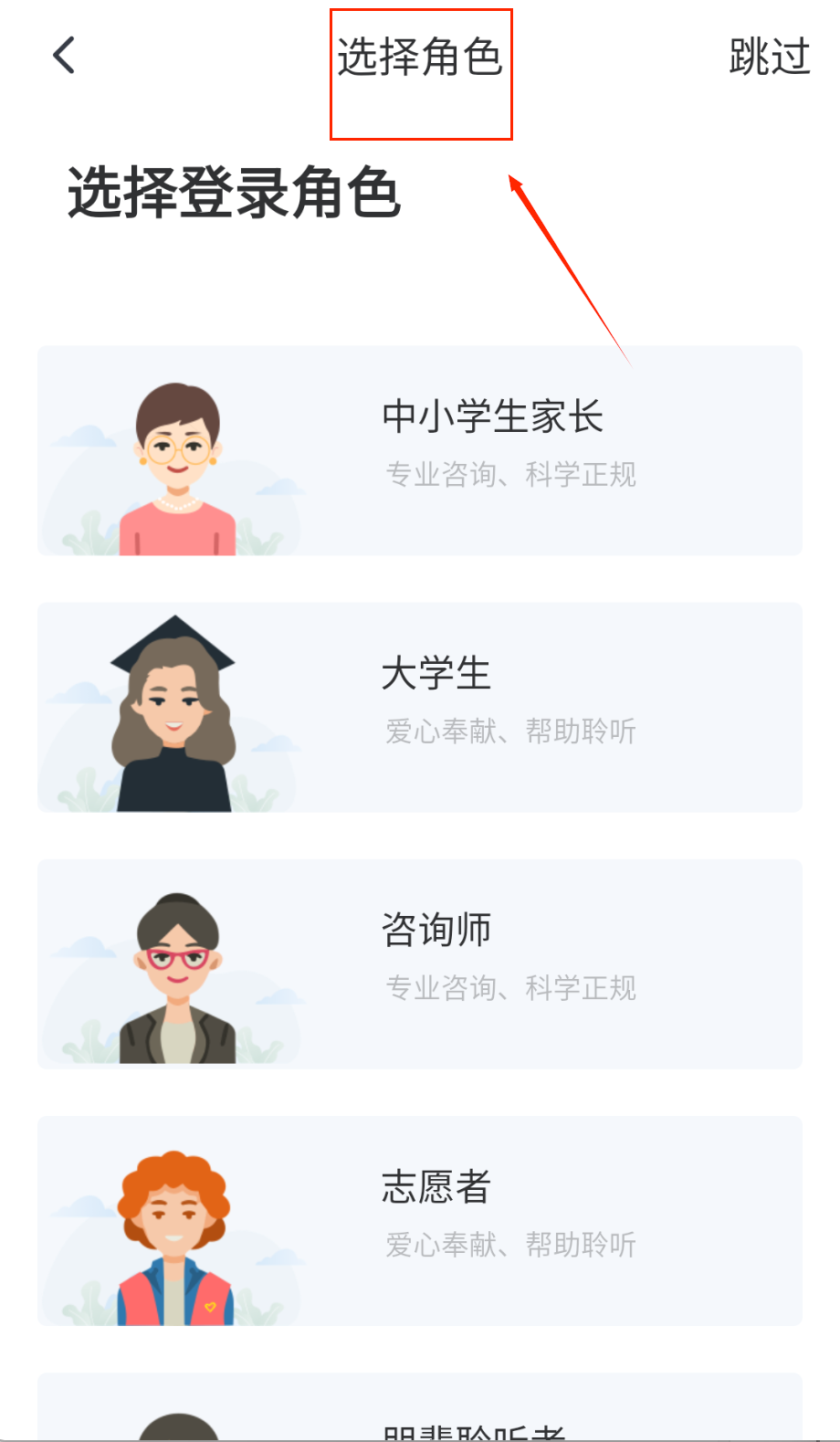 4、首次使用要选角色哦,有家长、学生、咨询师等不同身份可选,每个角色功能不一样,选好就能开始使用啦。