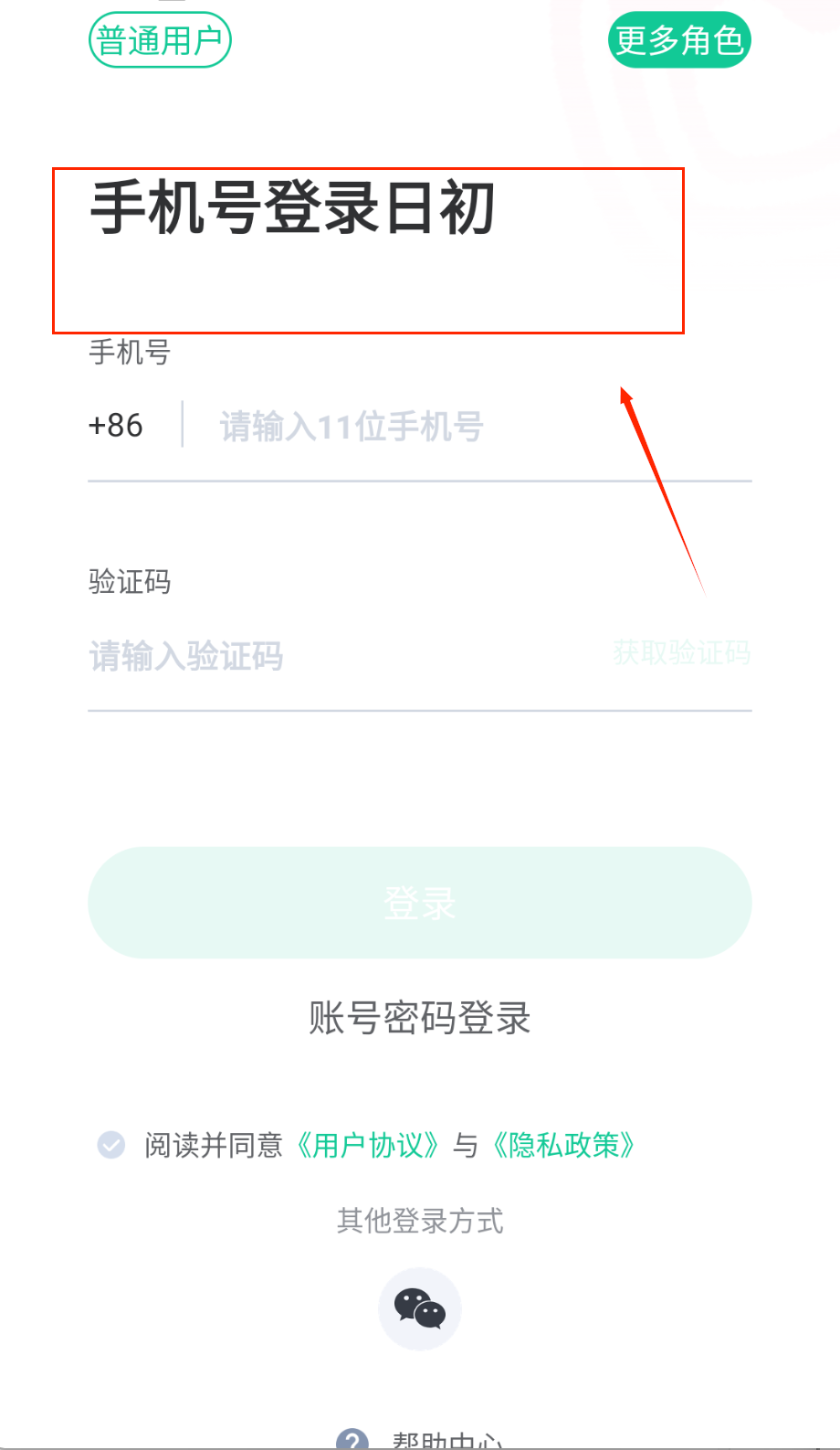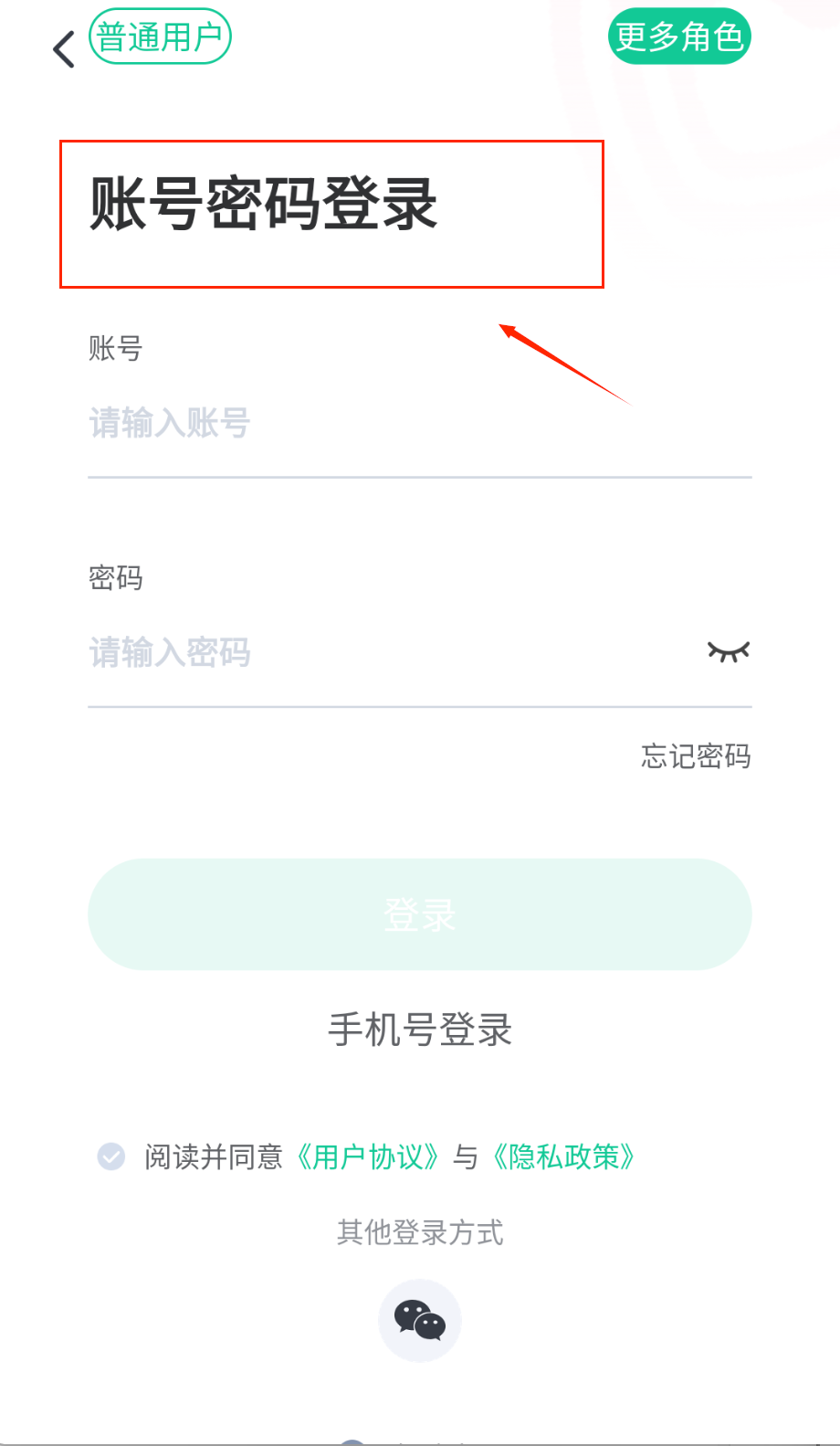 2、登录界面很简洁哟,顶部可以选择用户角色,中间输入账号密码,还能切换手机号登录,记得勾选同意协议再点登录按钮。