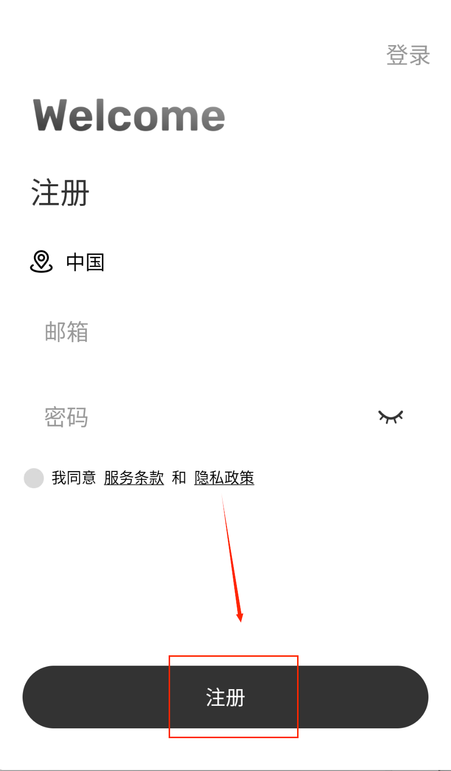 1、打开软件后点击右下角的注册按钮,输入邮箱和密码时注意密码要包含大小写字母,勾选同意条款后点击黑色注册按钮就能完成啦。