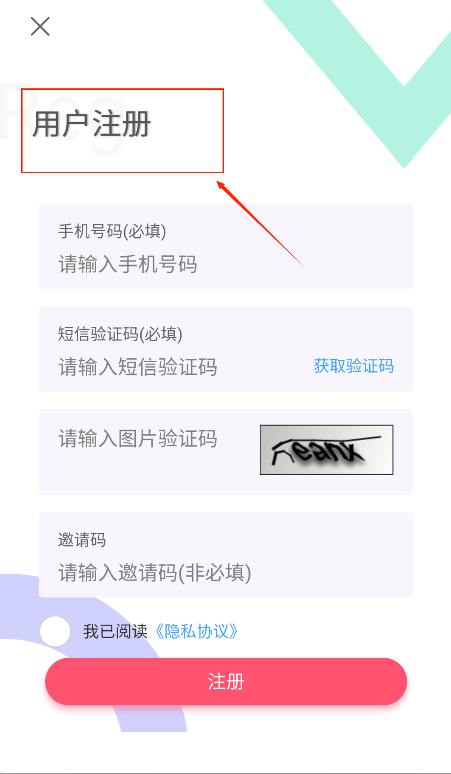 1、注册新账号时先填写手机号获取验证码,输入图片验证码"heahx"后勾选隐私协议,最后点击红色注册按钮就能完成啦。