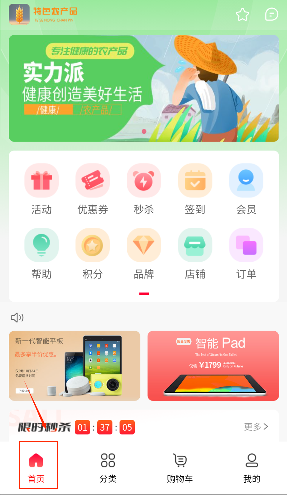 1、打开应用后可在首页浏览当季热销农产品与限时秒杀活动,通过地域筛选或关键词搜索快速找到心仪商品。