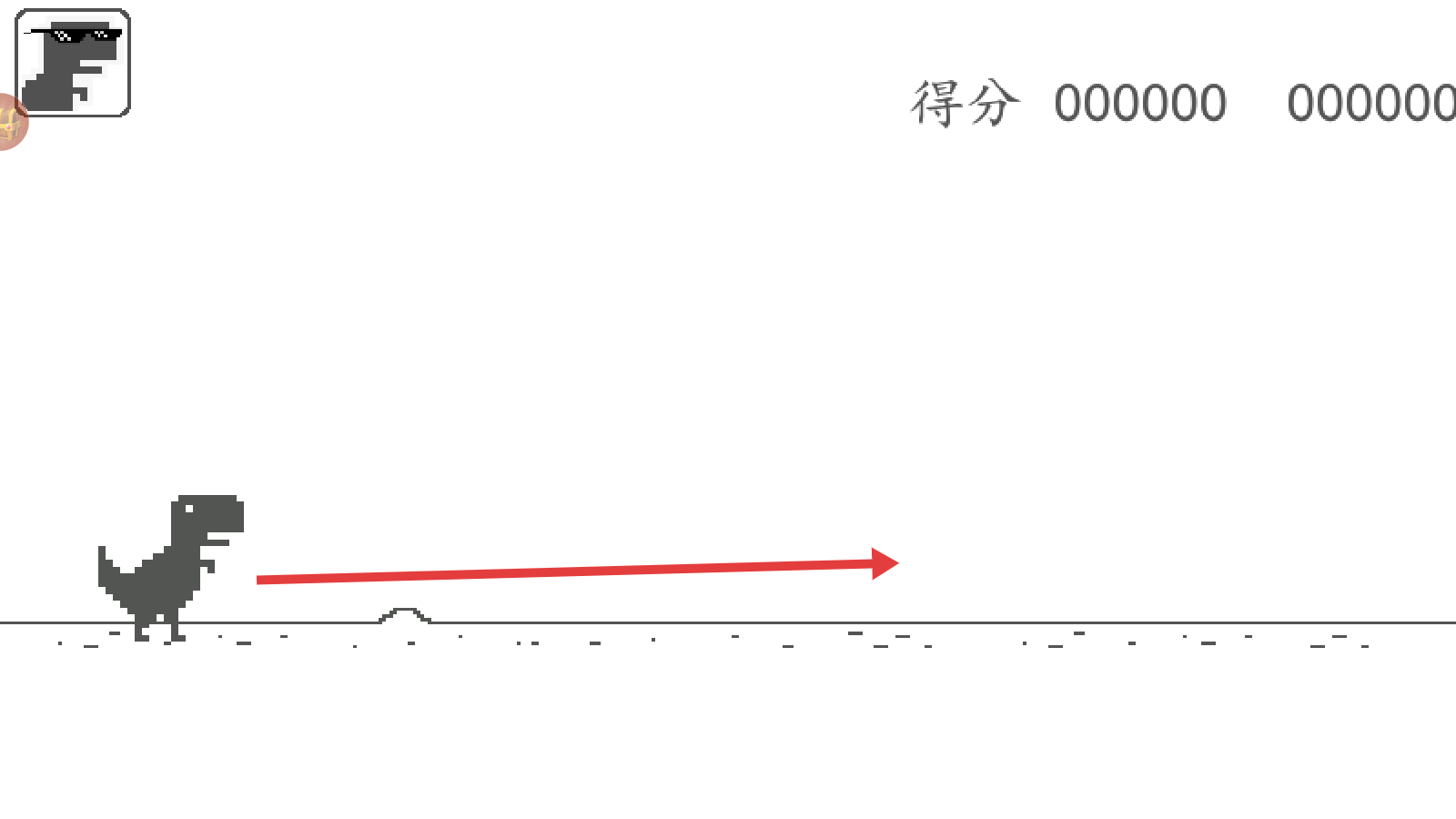 1、进入游戏,操控恐龙向右奔跑,初始【得分-000000】,熟悉移动节奏开启挑战。