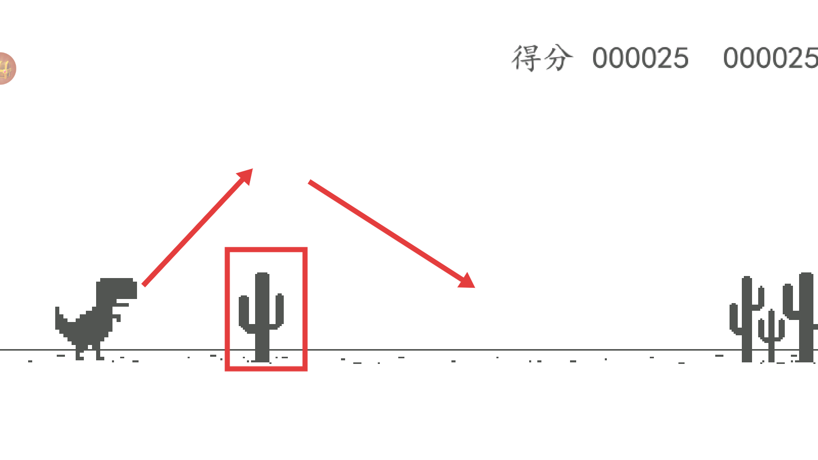 2、奔跑中遇【仙人掌】障碍,及时跳跃躲避,避免碰撞,维持节奏积累分数。