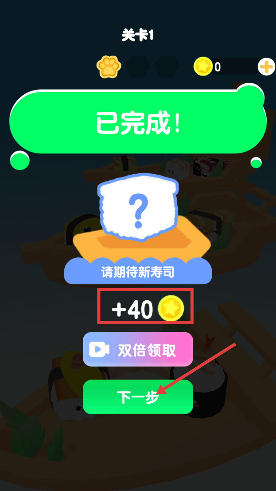 4、通关后领取【 40金币】,点击【下一步】解锁新寿司,也可看视频双倍领取收益。